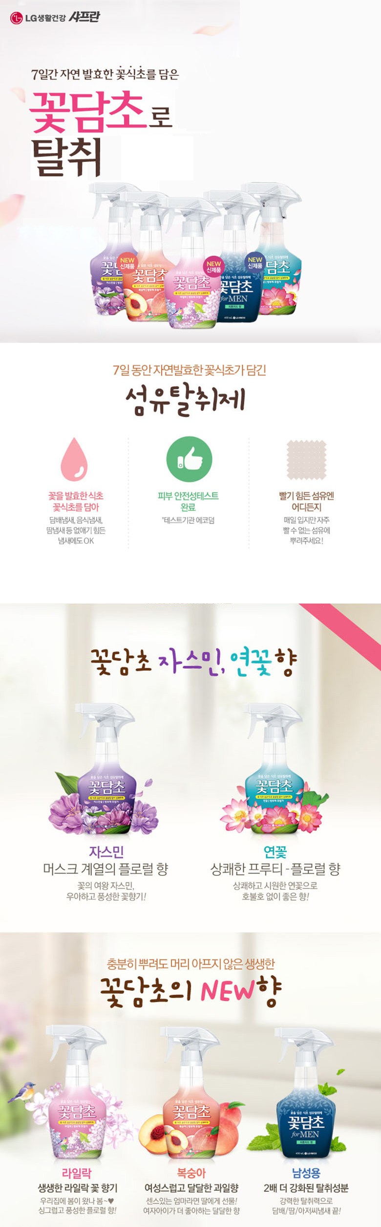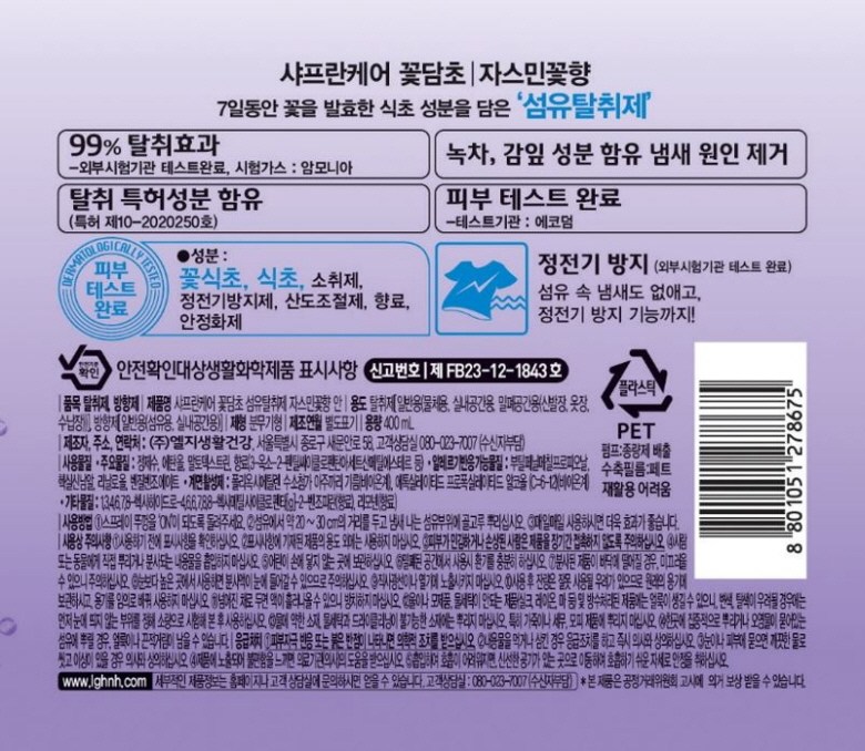 | 품목 및 제품명 | 방향제,탈취제 / 샤프란케어 꽃담초 섬유탈취제 자스민꽃향 안 | 용도(표백제의 경우 계열을 함께표시) 및 제형 | 일반용-실내공간용,일반용-섬유용,일반용-물체용,일반용-밀폐공간용-신발장, 옷장, 수납장 / 분사형-분무기형 |