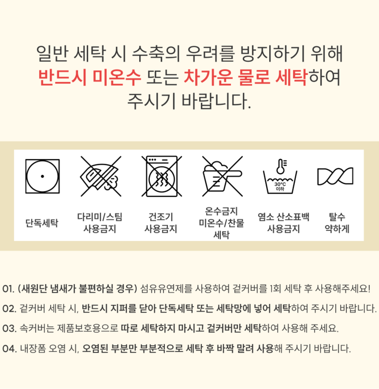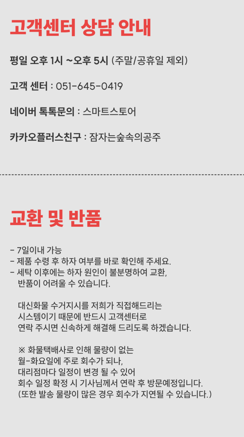 - ㆍ모니터 해상도의 차이로 인해 색상이나 이미지가 실제와 달라, 고객이 단순 변심으로 교환/반품을 무료로 요청하는 경우