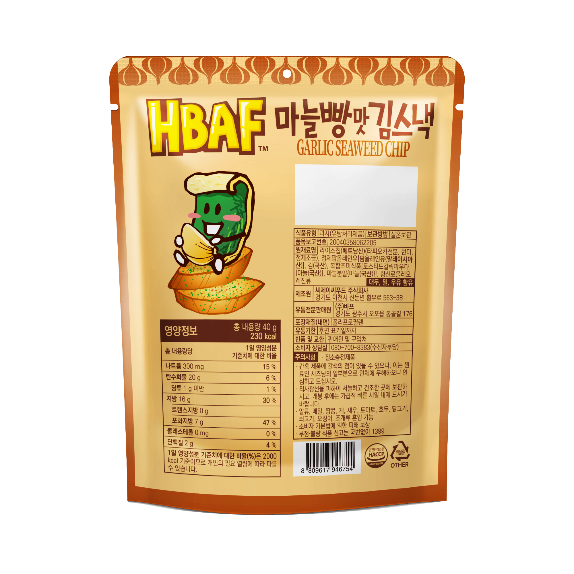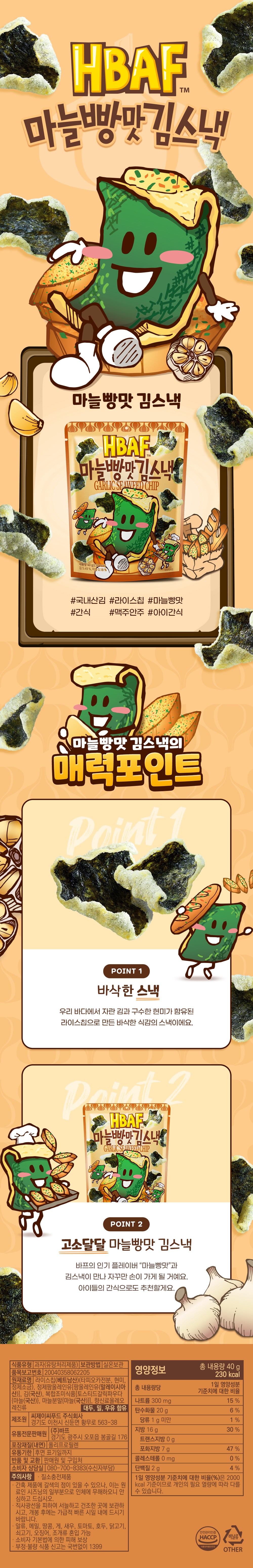 | 제품명 | HBAF 마늘빵맛 김스낵 | 식품의 유형 | 컨텐츠 참조 |