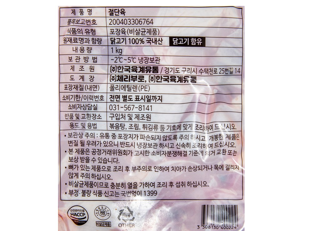 다양한 부위로 구성된 닭 절단육