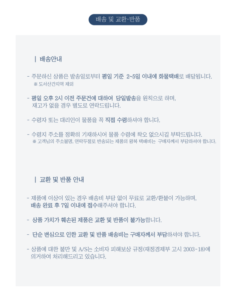 - ㆍ교환/반품에 관한 일반적인 사항은 판매자가 제시사항보다 관계법령이 우선합니다.