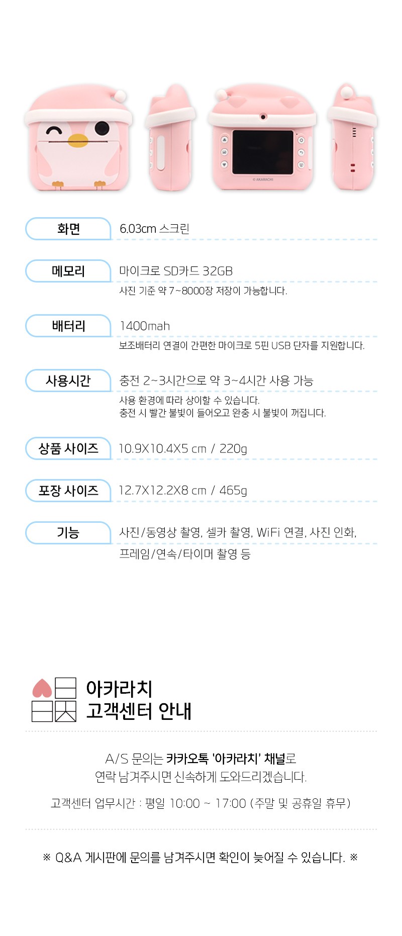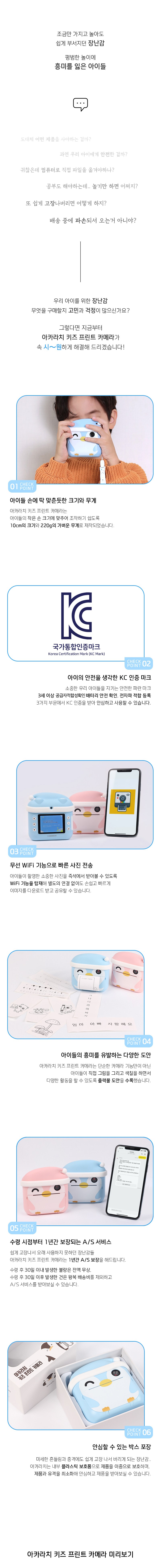 | 품명 및 모델명 | 아카라치 키즈 프린트 카메라 AKARACHI02 | KC 인증정보 | 본품 : 유/KC마크, R-R-K76-AKARACHI02 배터리 : XU100632-21009A |