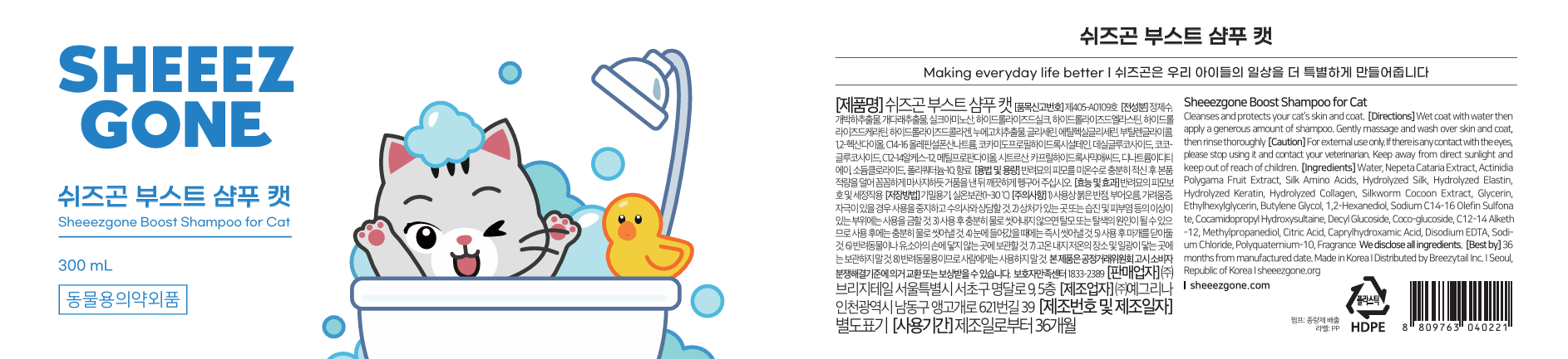 | 품명 및 모델명 | 쉬즈곤 부스트 샴푸 캣 | 인증/허가 사항 | 동물용 의약외품 |