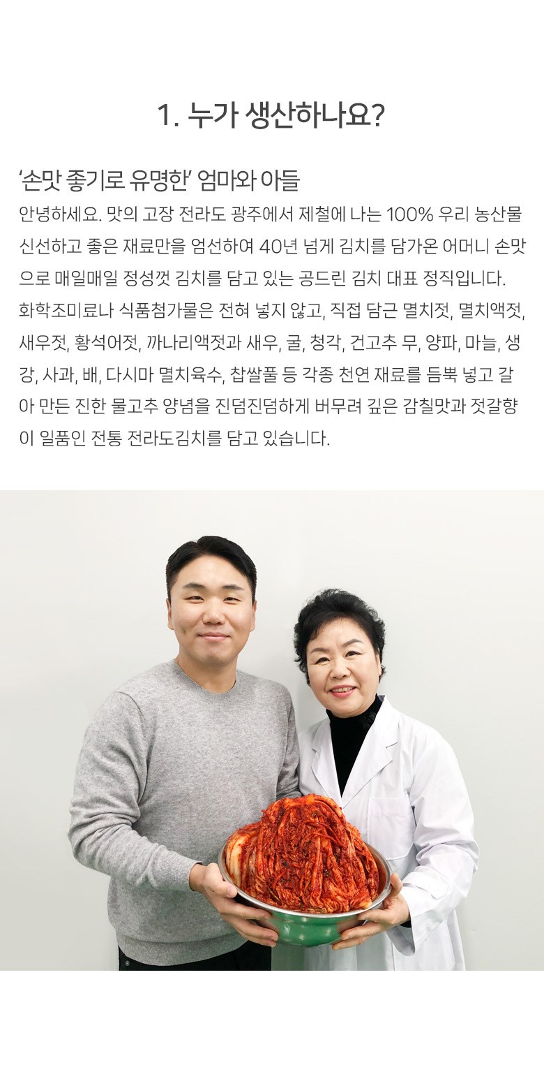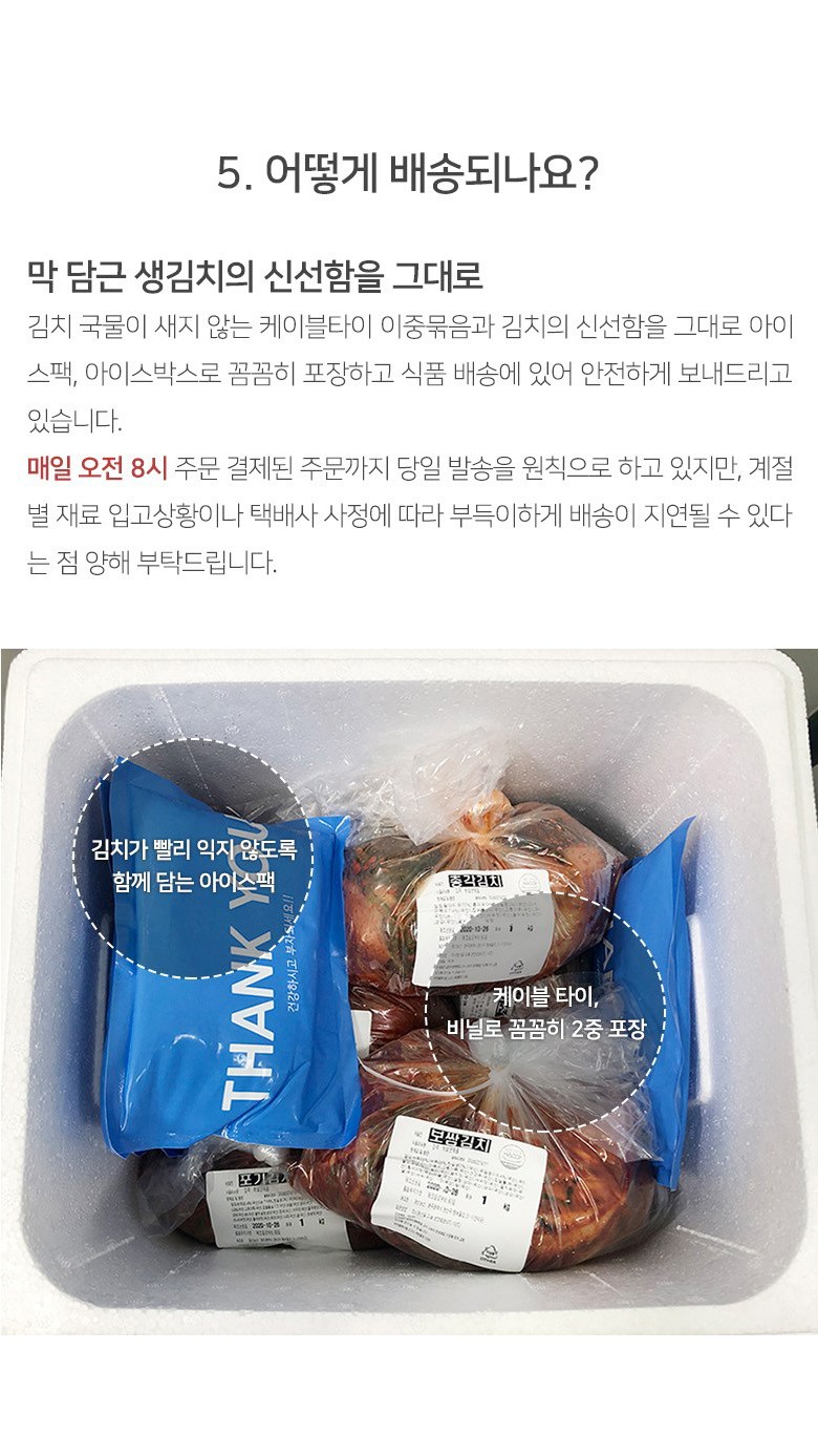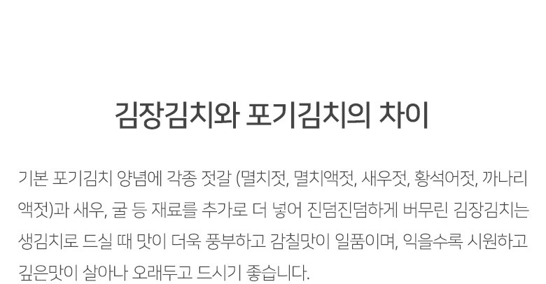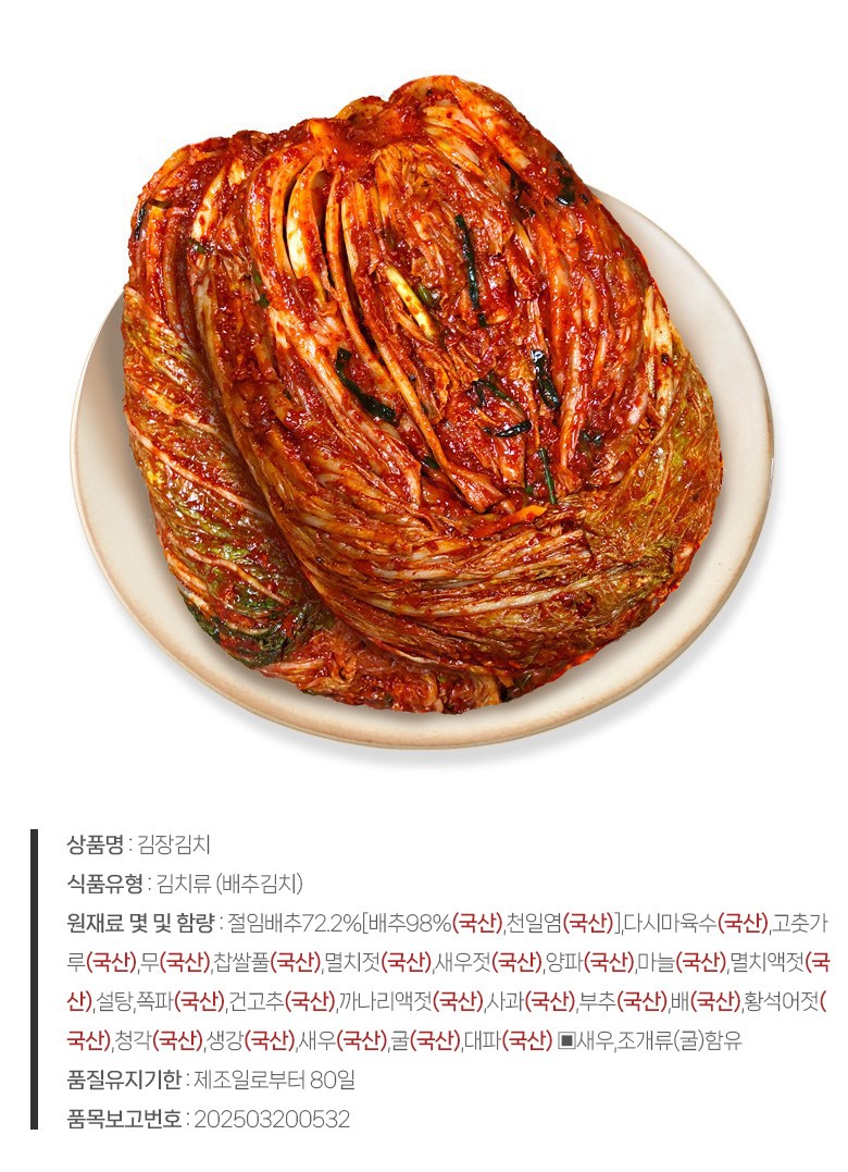 | 생산자 및 소재지 | 상품상세참조 | 제조연월일, 소비기한 또는 품질유지기한 | 김장김치는 매일 막 담근 싱싱한 생김치를 보내드립니다./제조일로부터 80일 |