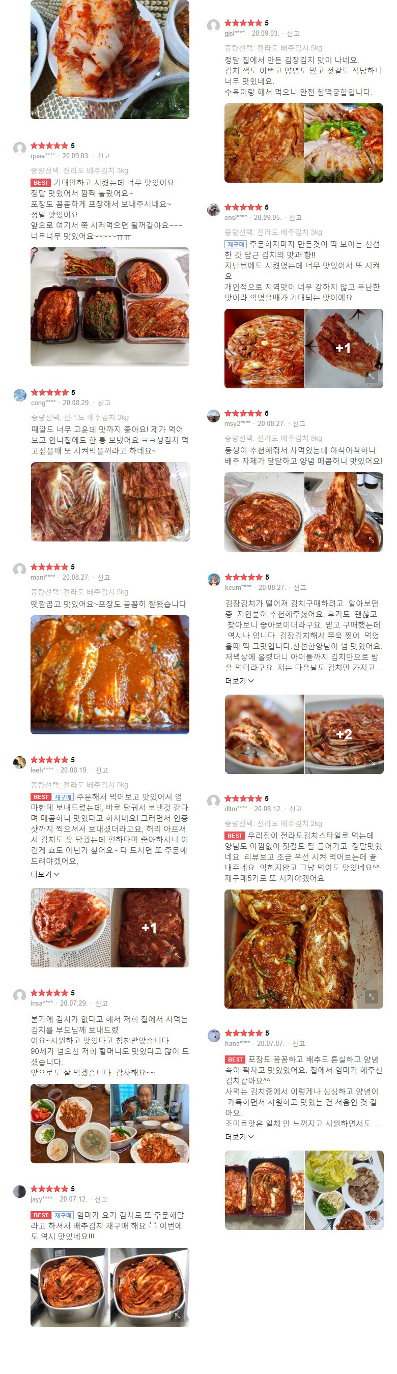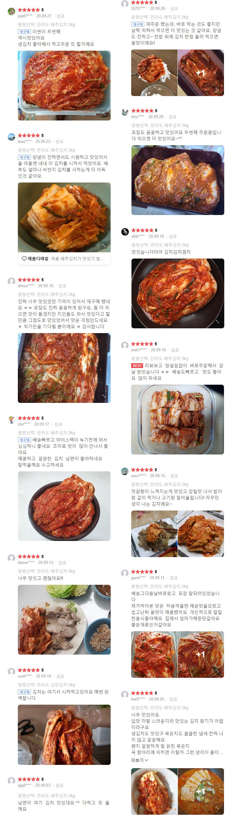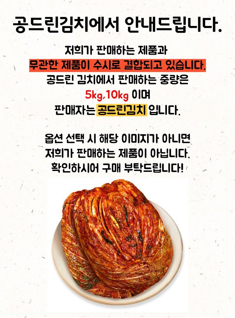 | 포장단위별 내용물의 용량(중량), 수량 | 5kg,10kg,20kg / 1개 | 원재료명 및 함량 | 절임배추72.2%[배추98%(국산),천일염(국산)],다시마육수(국산),고춧가루(국산),무(국산),찹쌀풀(국산),멸치젓(국산),새우젓(국산),양파(국산),마늘(국산),멸치액젓(국산),설탕,쪽파(국산),건고추(국산),까나리액젓(국산),사과(국산),부추(국산),배(국산),황석어젓(국산),청각(국산),생강(국산),새우(국산),굴(국산),대파(국산) |