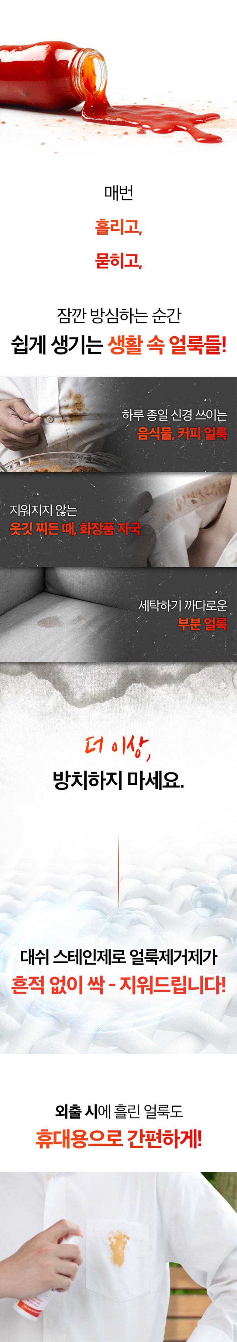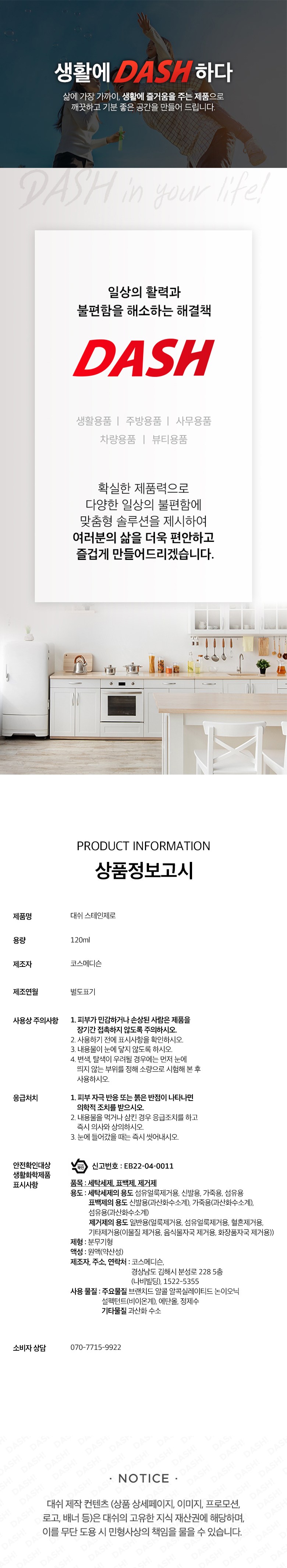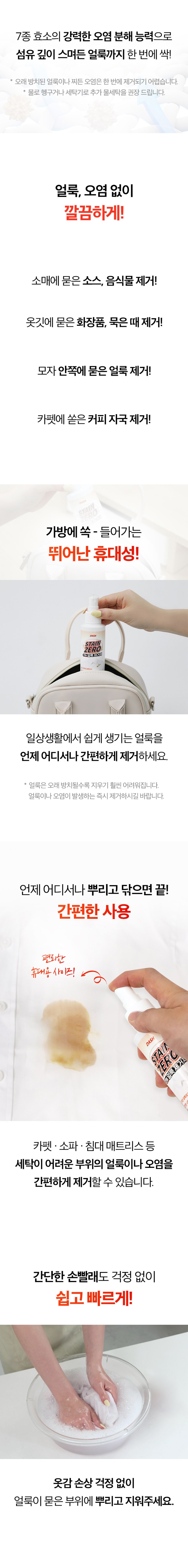 | 품목 및 제품명 | 세탁세제, 표백제, 제거제 / 대쉬 스테인제로 | 용도(표백제의 경우 계열을 함께표시) 및 제형 | 세탁세제(섬유얼룩제거용, 신발용, 가죽용, 섬유용), 표백제(신발용(과산화수소계), 가죽용(과산화수소계), 섬유용(과산화수소계)) / 분무기형 |