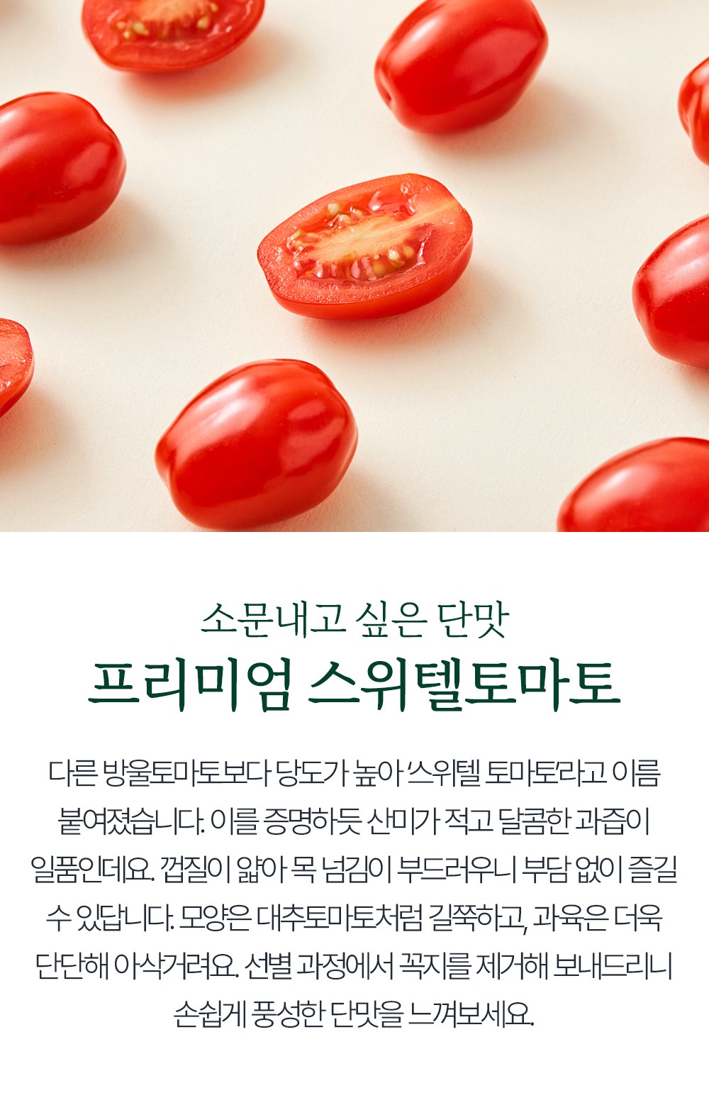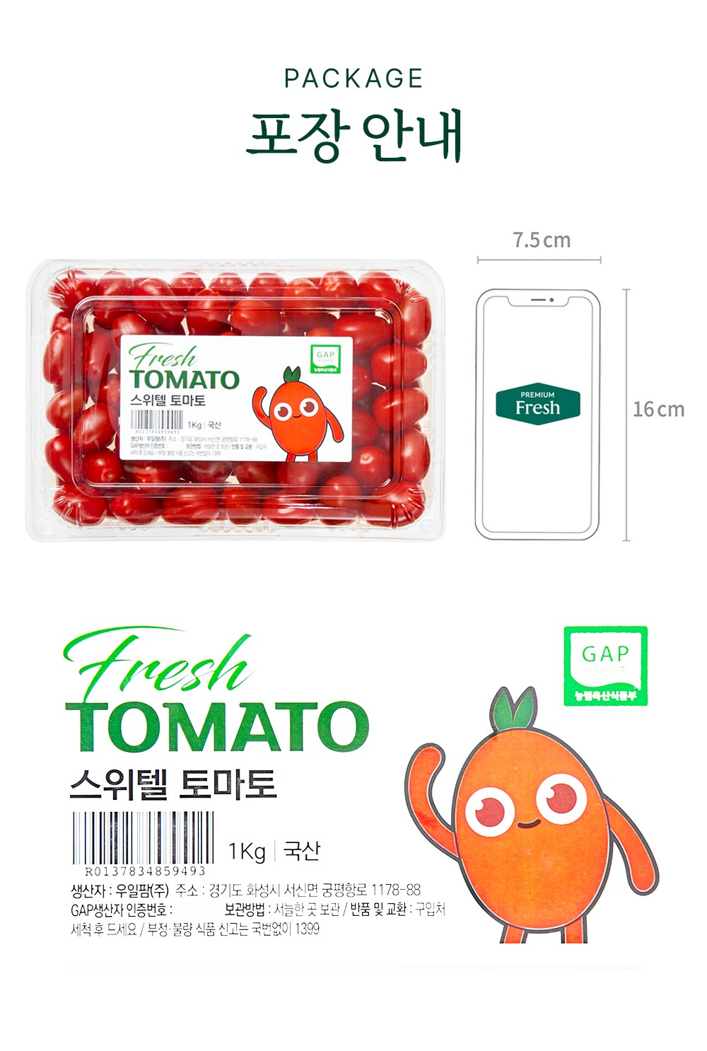 | 품목 또는 명칭 | Fresh TOMATO 스위텔 토마토 | 포장단위별 내용물의 용량(중량),수량,크기 | 1kg x 2개,1개 |