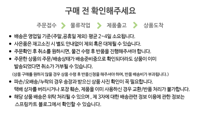 | 배송기간 | ㆍ도서산간 지역 등은 배송에 3-5일이 더 소요될 수 있습니다. - 천재지변, 물량 수급 변동 등 예외적인 사유 발생 시, 다소 지연될 수 있는 점 양해 부탁드립니다. | ||