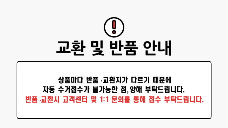 - ㆍ교환/반품에 관한 일반적인 사항은 판매자가 제시사항보다 관계법령이 우선합니다.