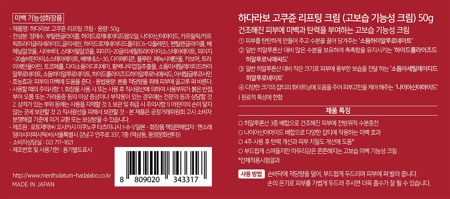 | 화장품제조업자, 화장품책임판매업자 및 맞춤형화장품판매업자 | 로토제약(주) / 맨소래덤아시아퍼시픽(주) | 제조국 | 일본 |