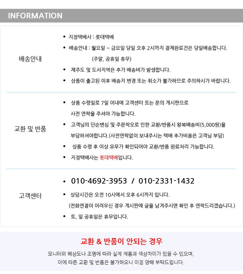- ㆍ모니터 해상도의 차이로 인해 색상이나 이미지가 실제와 달라, 고객이 단순 변심으로 교환/반품을 무료로 요청하는 경우