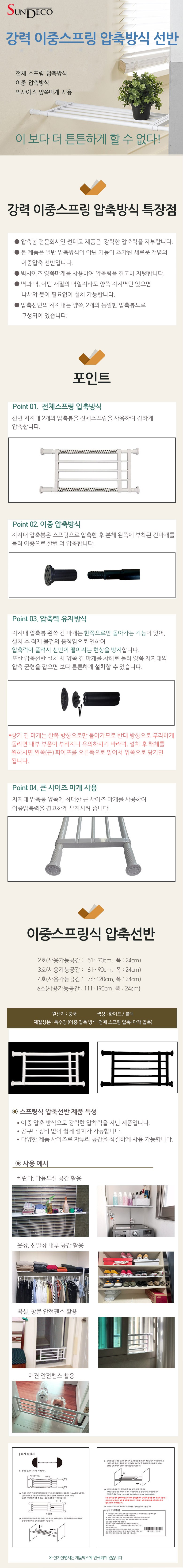 | 품명 및 모델명 | 썬데코 이중 스프링식 압축선반 3호 61~90cm | 인증/허가 사항 | 해당없음 |