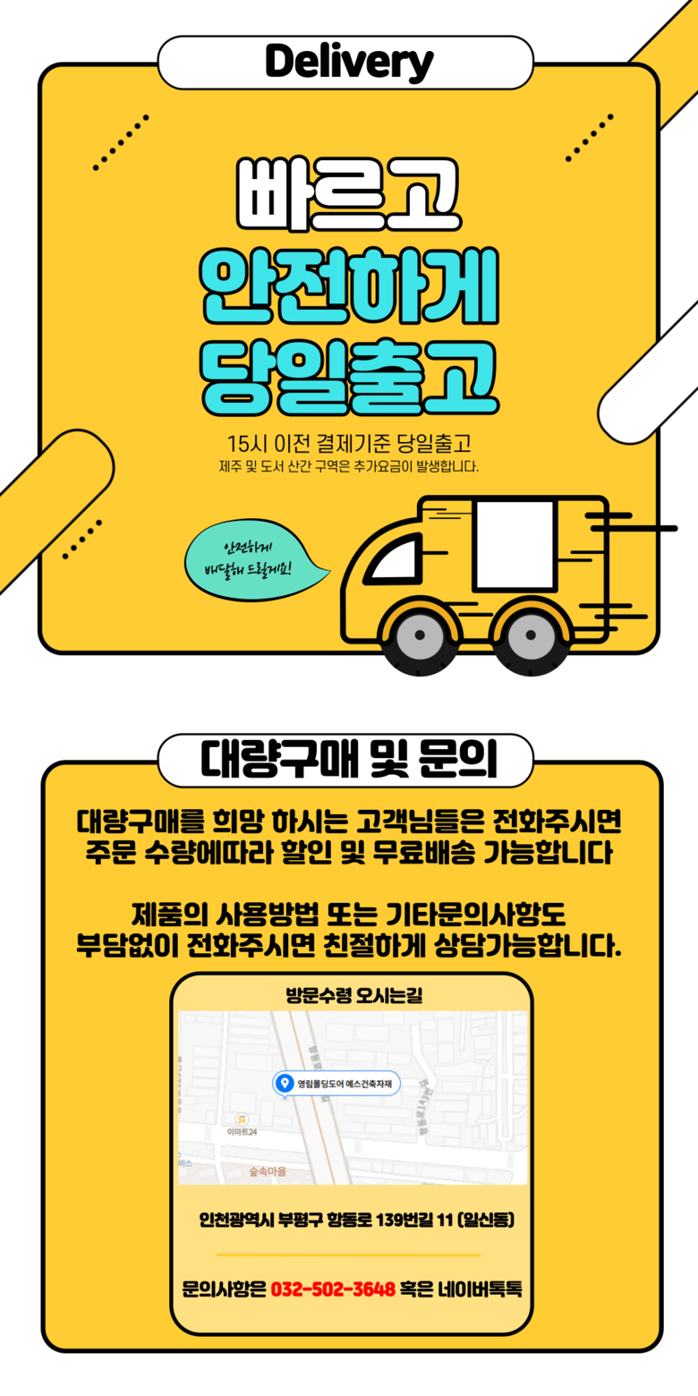 상호/대표자 | 주식회사 예스건축자재 / 박종민 | 사업장 소재지 | 인천광역시 부평구 항동로139번길 11 예스건축자재 |