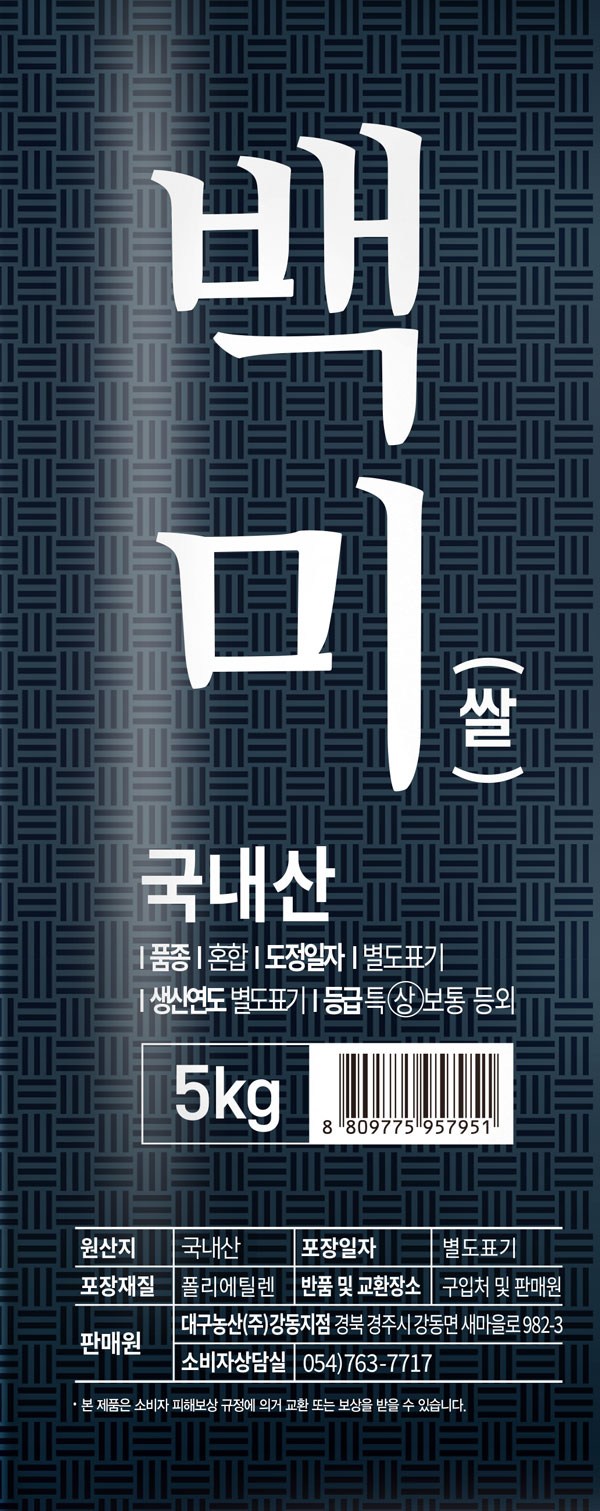 | 품목 또는 명칭 | 백미(쌀) | 포장단위별 내용물의 용량(중량),수량,크기 | 5kg |