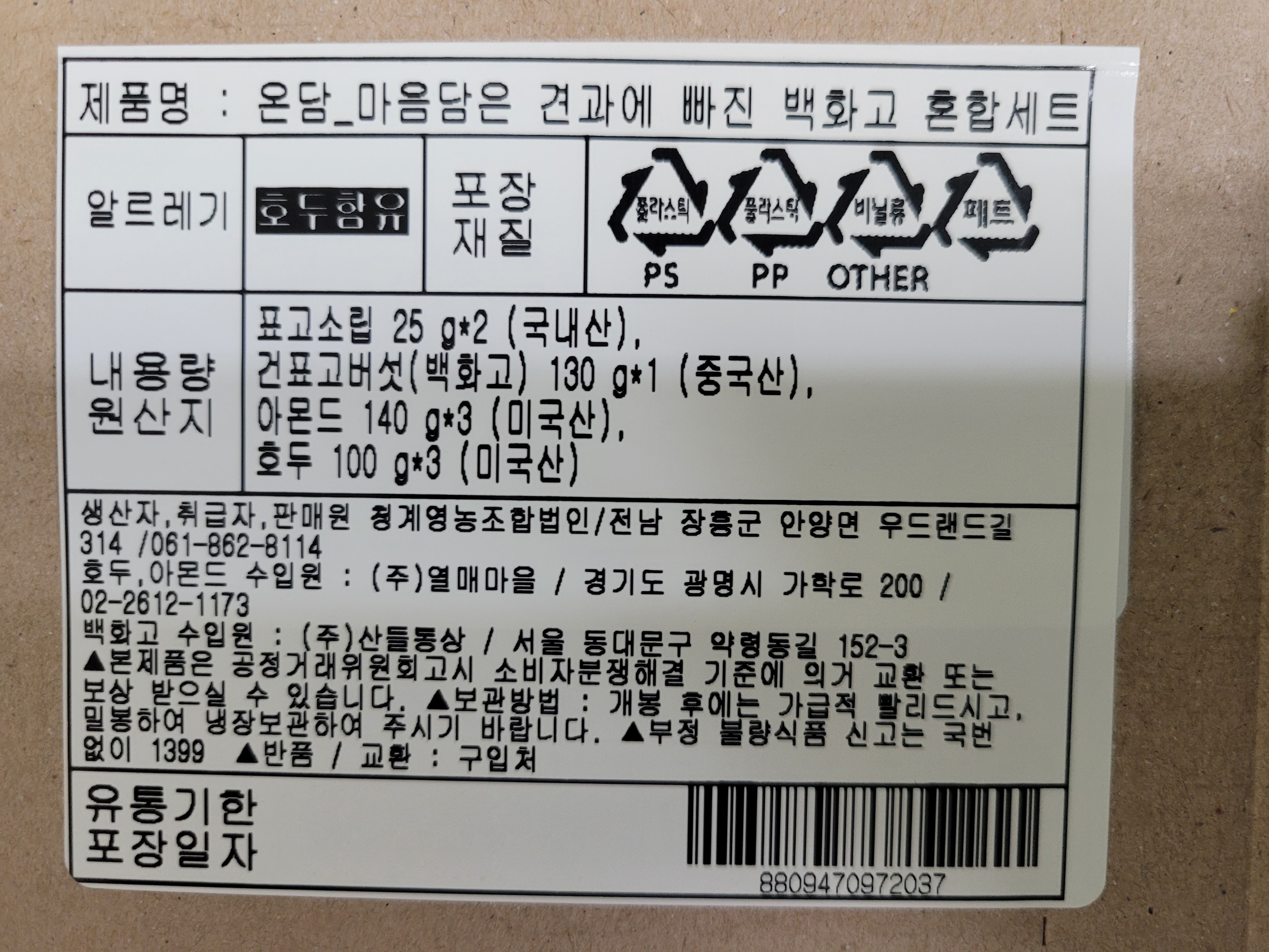 | 제조연월일, 소비기한 또는 품질유지기한 | 소비기한(또는 유통기한) : 2026년 08월 31일 이거나 그 이후인 상품<br />제조년월일 : 2025년 09월 01일 이후인 제조상품 | 세부 품목군별 표시사항 | 농수산물 : -유전자변형 : 해당없음 - 지리적 표시사항 : 해당없음 |