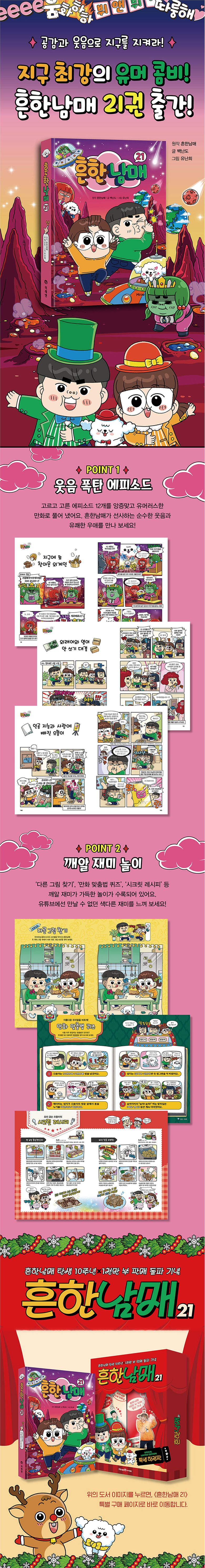 《흔한남매》 시리즈는 ‘흔한남매’ 유튜브 영상의 스토리를 앙증맞고 유머러스한 만화로 풀어 낸 코믹북입니다. 하루도 조용할 날이 없는 으뜸이와 에이미의 일상 스토리는 진짜 웃음이 필요한 어린이들에게 유쾌한 우애와 순수한 웃음을 선사할 것입니다.