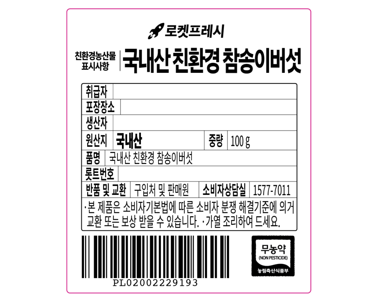 | 품목 또는 명칭 | 국내산 친환경 참송이버섯 | 포장단위별 내용물의 용량(중량),수량,크기 | 100gx4개 |