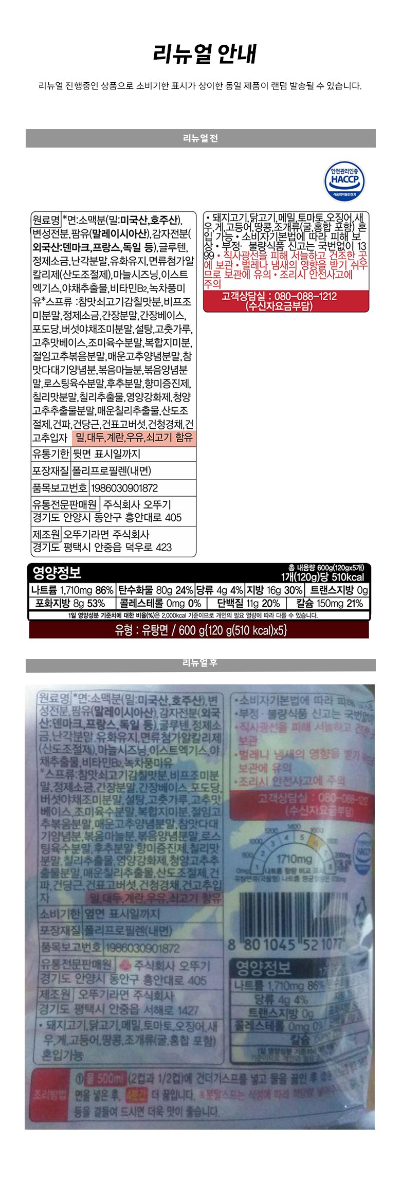| 제품명 | 오뚜기 열라면 | 식품의 유형 | 유탕면류 |