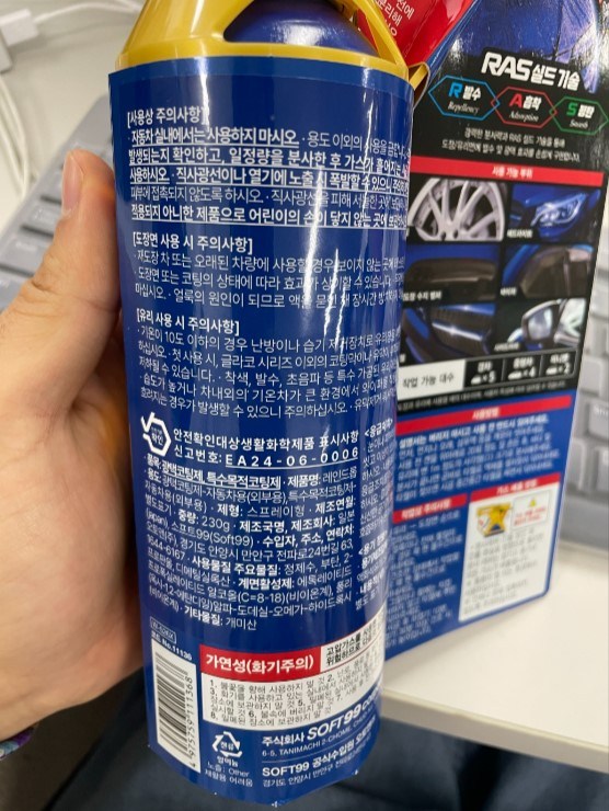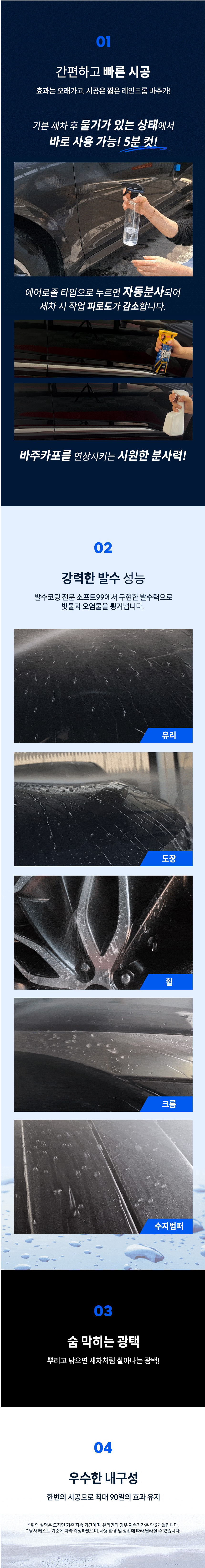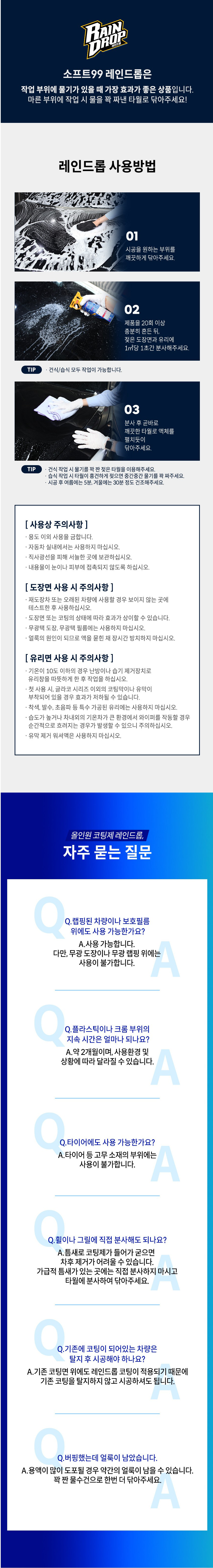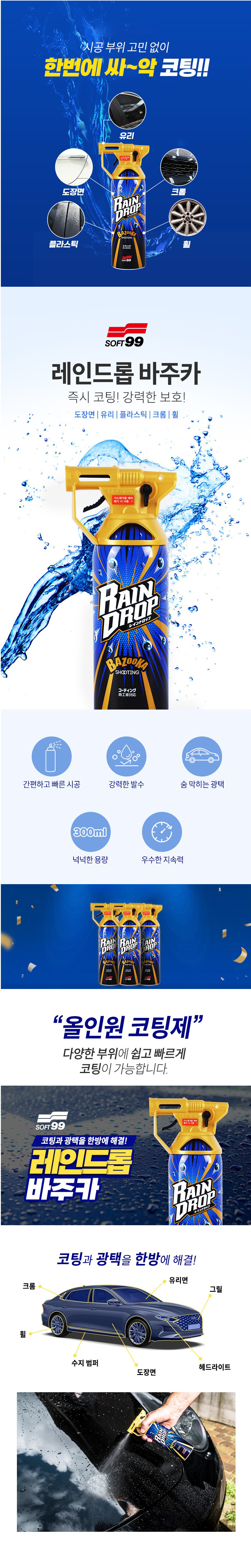 | 품목 및 제품명 | 광택 코팅제,특수목적코팅제/레인드롭 | 용도(표백제의 경우 계열을 함께표시) 및 제형 | 광택코팅제-자동차용(외부용), 특수목적코팅제-자동차용(외부용)/스프레이형 |
