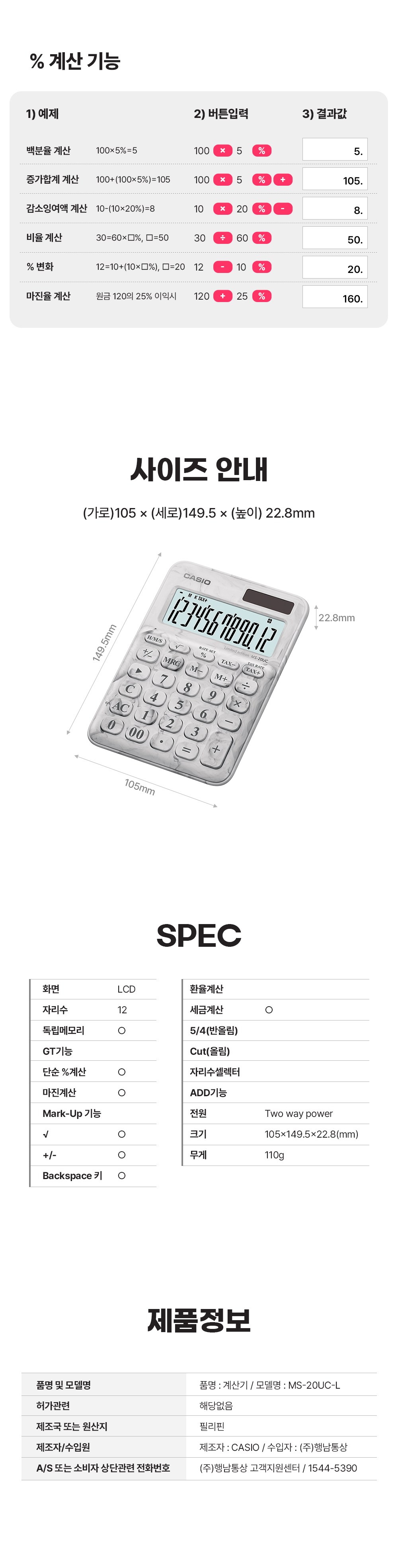 | 품명 및 모델명 | 계산기 / MS-20UC-L | 인증/허가 사항 | 해당없음 |