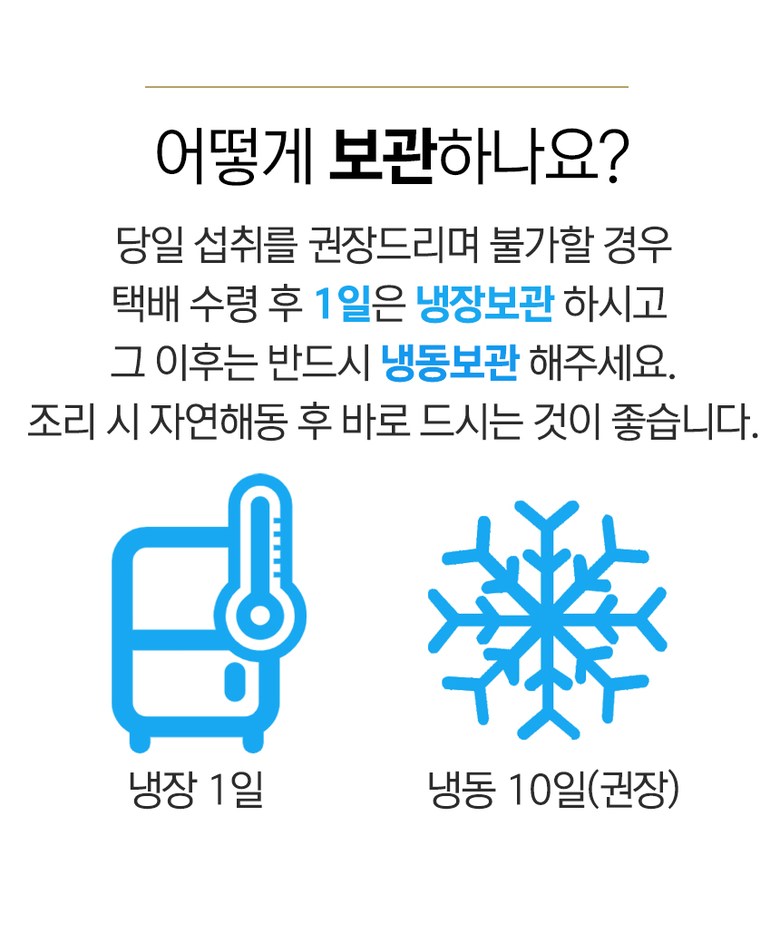 | 배송방법 | 신선/냉장/냉동 | 배송비 | 무료배송 - 도서산간 지역 배송불가 |