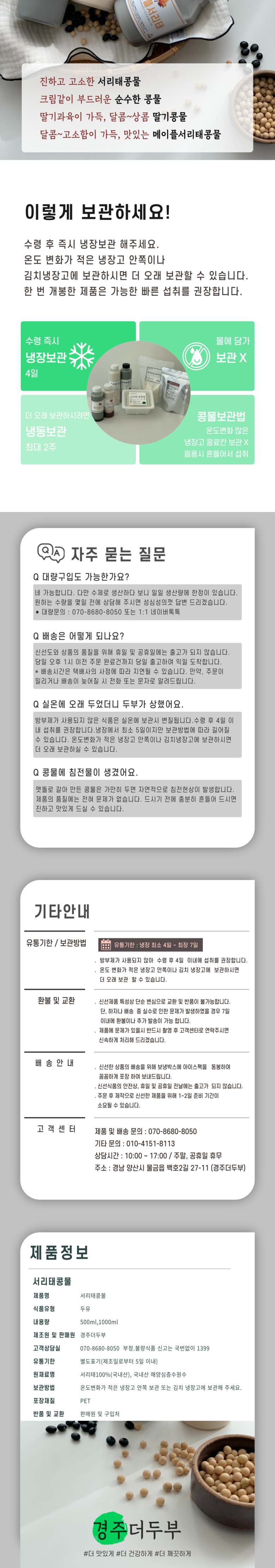 | 생산자 및 소재지 | 경주더두부/경남 양산시 물금읍 백호2길 27-11 | 제조연월일, 소비기한 또는 품질유지기한 | 당일 제조 및 발송, 수령후 2일 이내 섭취 권장. 냉장 보관 방법에 따라 유통기한 연장됩니다. |