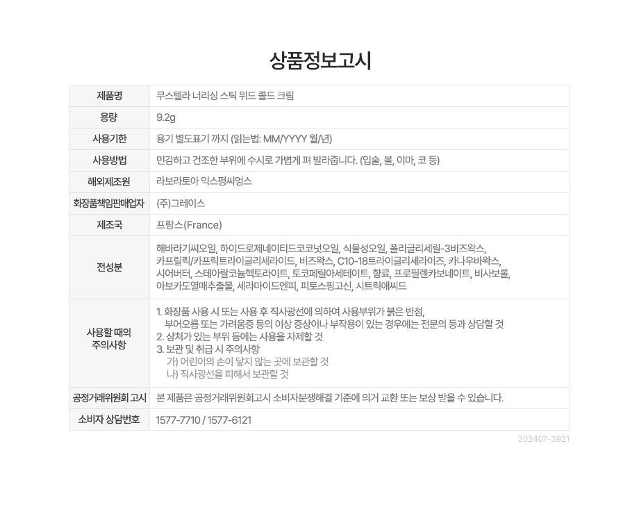 | 화장품제조업자, 화장품책임판매업자 및 맞춤형화장품판매업자 | 컨텐츠 참조 | 제조국 | 프랑스 |
