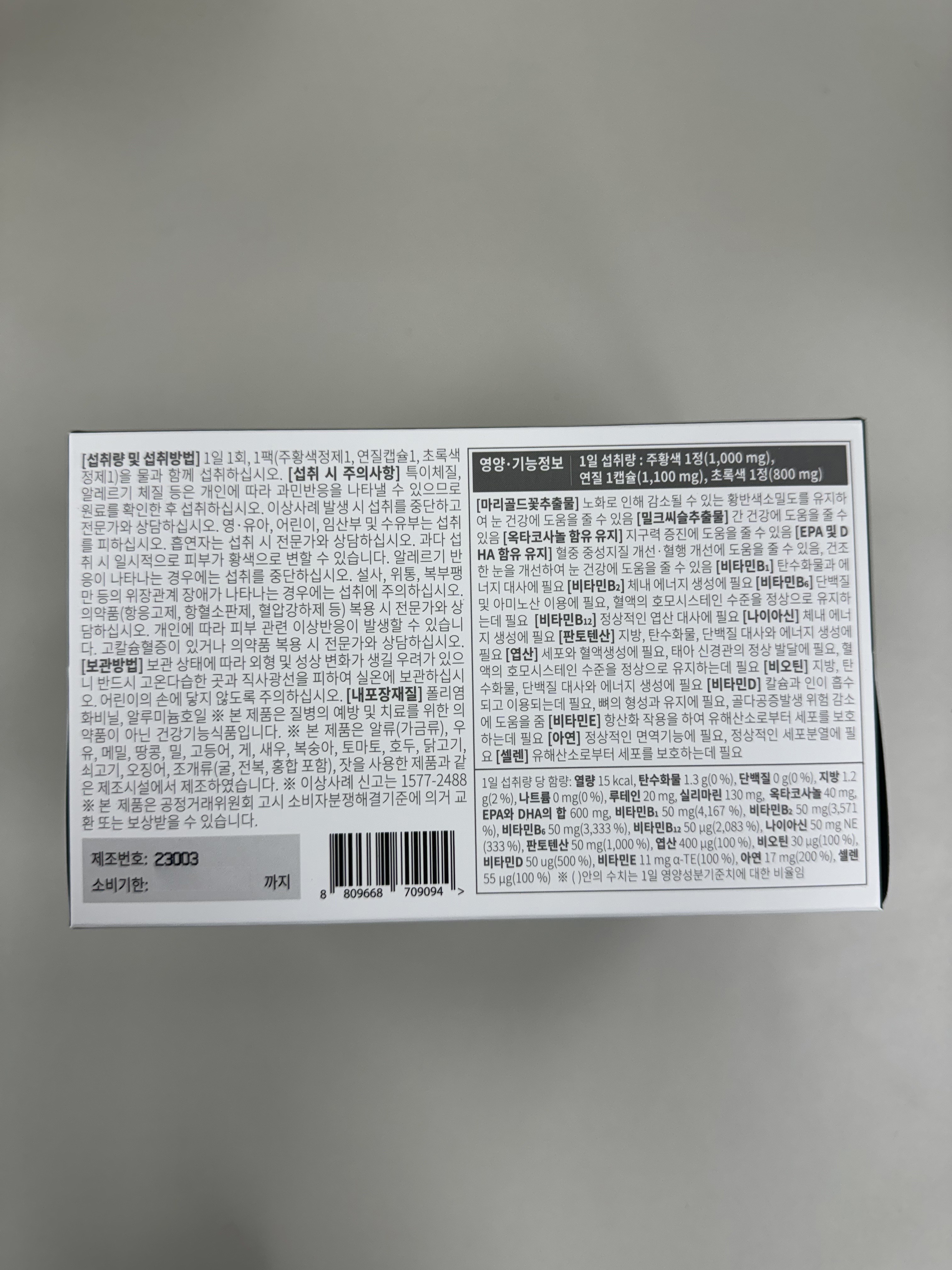 | 소비기한 및 보관방법 | 소비기한(또는 유통기한) : 2026년 09월 27일 이거나 그 이후인 상품 제조년월일 : 2025년 04월 01일 이후인 제조상품 보관방법: 컨텐츠 참조 | 포장단위별 내용물의 용량(중량), 수량 | 90정 x 3개 |