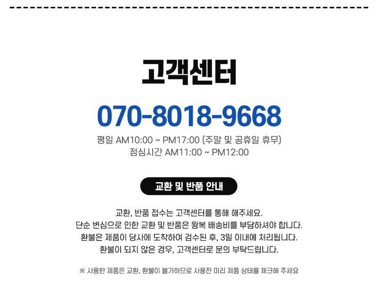 - ㆍ모니터 해상도의 차이로 인해 색상이나 이미지가 실제와 달라, 고객이 단순 변심으로 교환/반품을 무료로 요청하는 경우