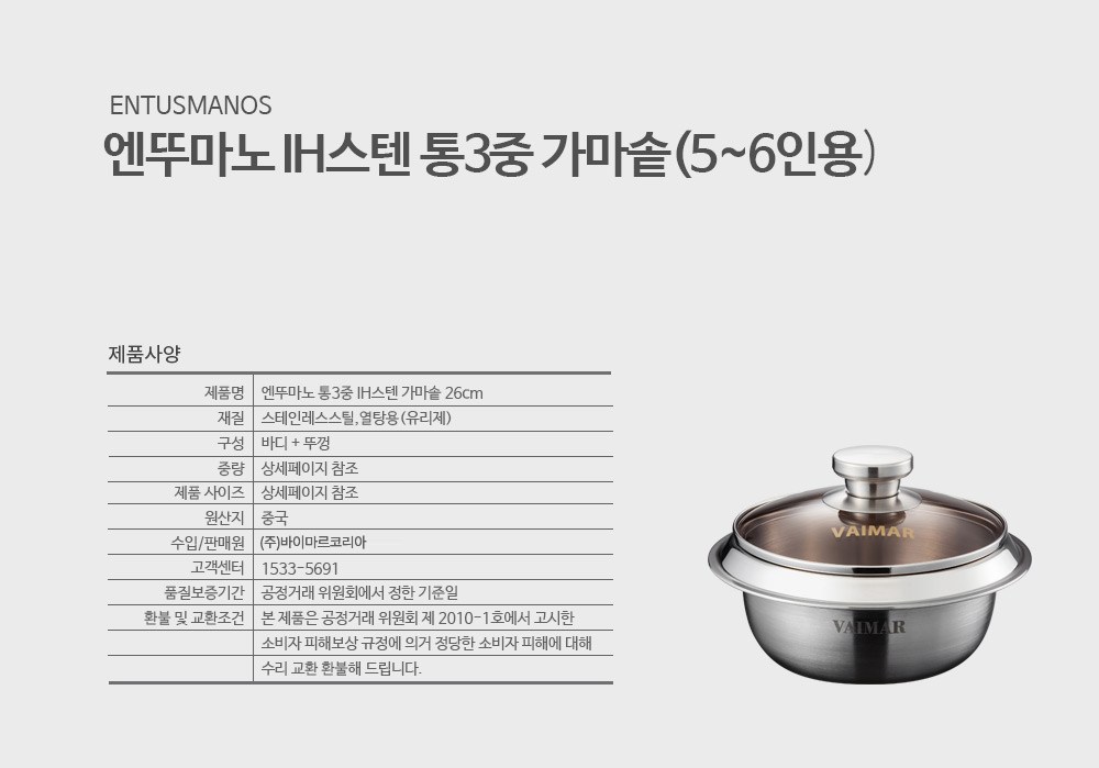| 품명 및 모델명 | 엔뚜마노 통3중 IH스텐 가마솥 5~6인용 | 재질 | 컨텐츠 참조 |