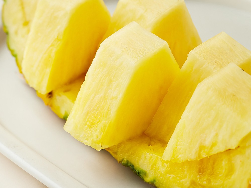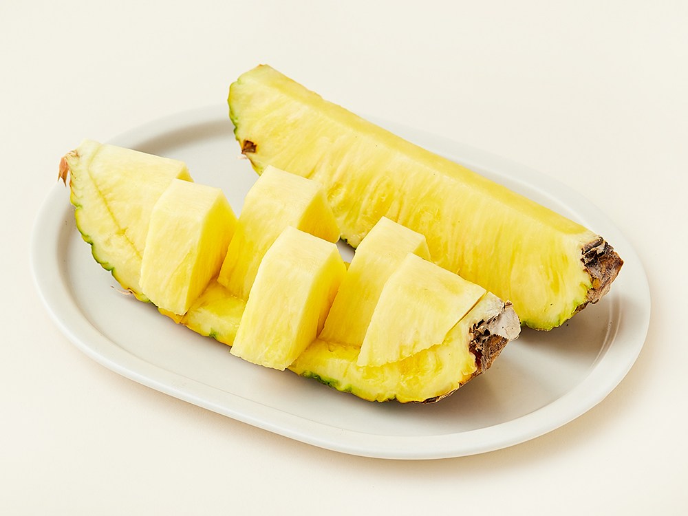 파인애플의 주산지, 필리핀의 뜨거운 태양 아래 자란 파인애플입니다. 보통 파인애플의 생육 기간은 15개월 내외이지만, 최대 90일까지 그 기간을 늘려 재배하고 가장 맛있게 후숙되는 시점까지 기다린 후에 수확했어요. 한층 더 짙어진 노란빛은 과육이 완전히 익었다는 신호죠. 덕분에 당도는 높고, 상대적으로 신맛이 덜하답니다. 손쉽게 드실 수 있도록 파인애플 위의 크라운을 제거해 보내드려요.