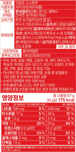 | 포장단위별 내용물의 용량(중량), 수량 | 67g*12개 | 원재료명 및 함량 | 컨텐츠 참조 |