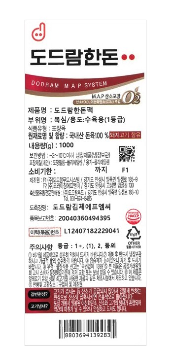 신선도를 유지하기 위해 MAP(Modified Atmospheres Packaging) 기법으로 포장했어요. 용기 내에 산소와 이산화탄소를 채워 고기의 맛과 품질을 유지합니다.