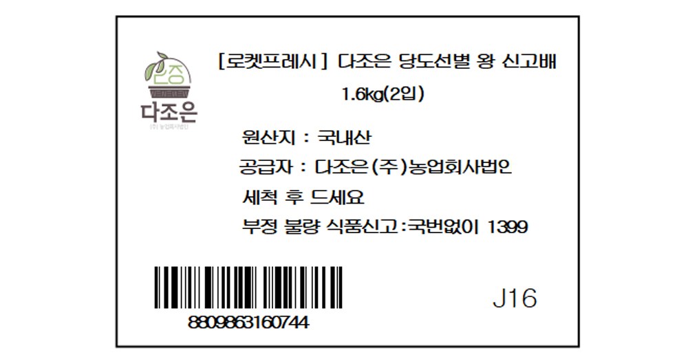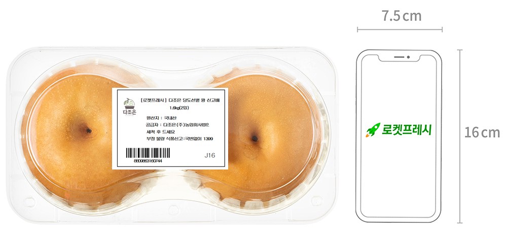 | 품목 또는 명칭 | 다조은 천안 왕 신고배 | 포장단위별 내용물의 용량(중량),수량,크기 | 1.6kg(2입) x 2개,1개 |