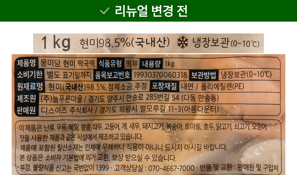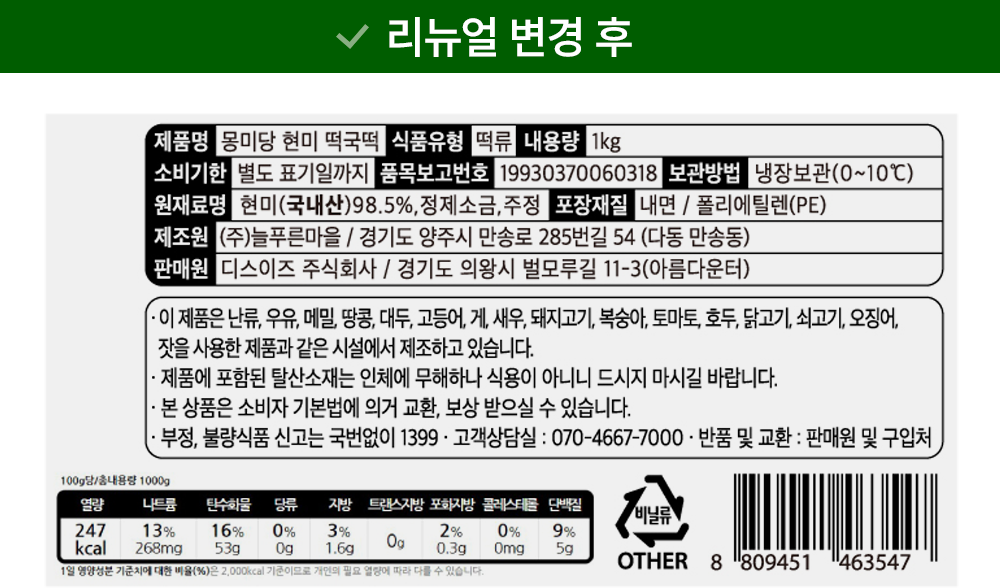 | 제품명 | 몽미당-현미 떡국떡 | 식품의 유형 | 컨텐츠 참조 |