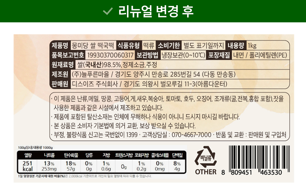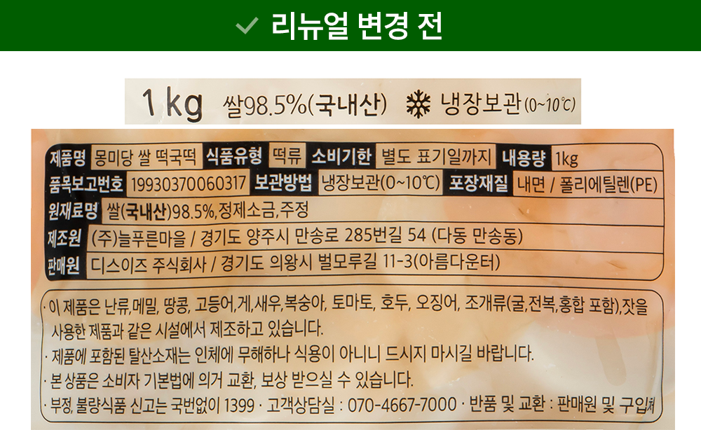 | 제품명 | 몽미당-쌀 떡국떡 | 식품의 유형 | 컨텐츠 참조 |