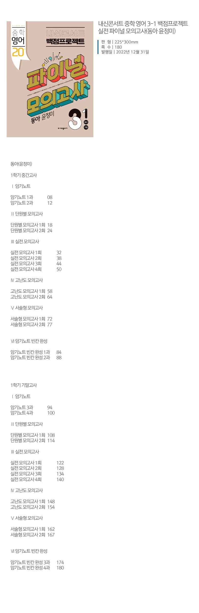 | 도서명 | 내신콘서트 백점프로젝트 실전 파이널 모의고사 중학 영어 3-1 중간 기말 동아 윤정미 | 저자, 출판사 | 에듀플라자, 에듀플라자 |