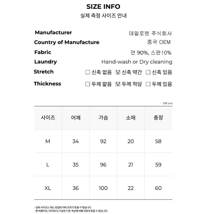| 제조국 | 중국OEM | 세탁방법 및 취급시 주의사항 | 상세페이지 참조 |