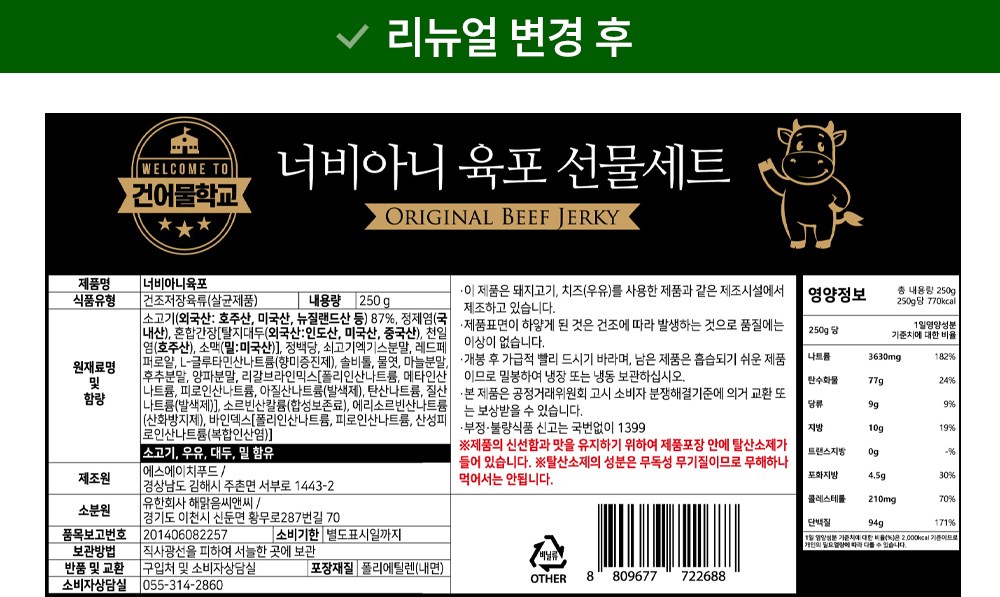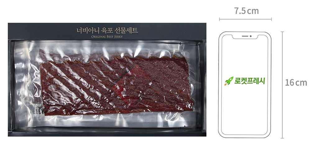 쫄깃쫄깃한 식감을 자랑하는 너비아니 육포예요. 씹을수록 입안에 퍼지는 짭조름한 감칠맛이 일품이랍니다. 출출할 때 간식으로 활용해도 좋고, 맥주 한 잔이 생각날 때 술안주로도 안성맞춤이에요. 소중한 분께 전할 센스 있는 선물로 제격이지요.