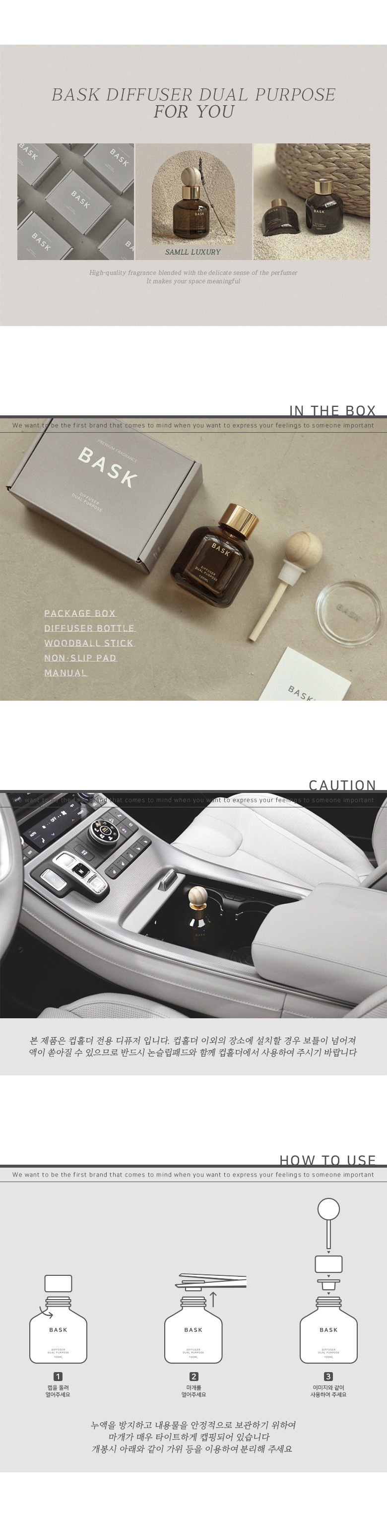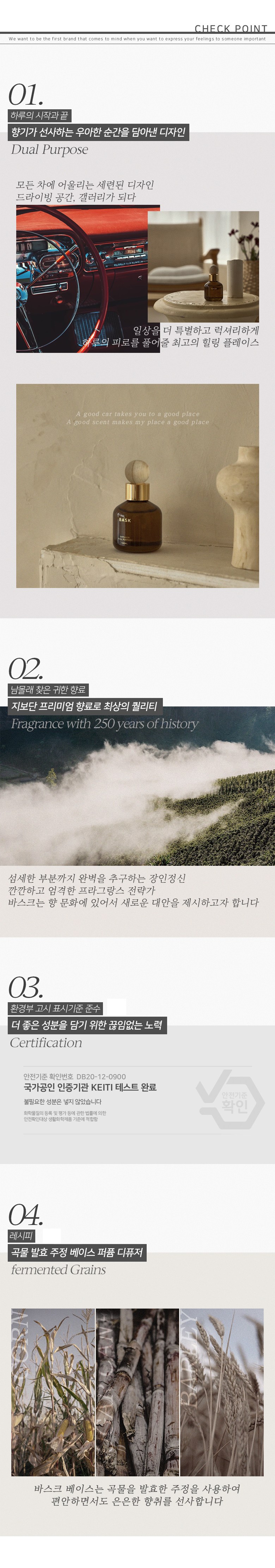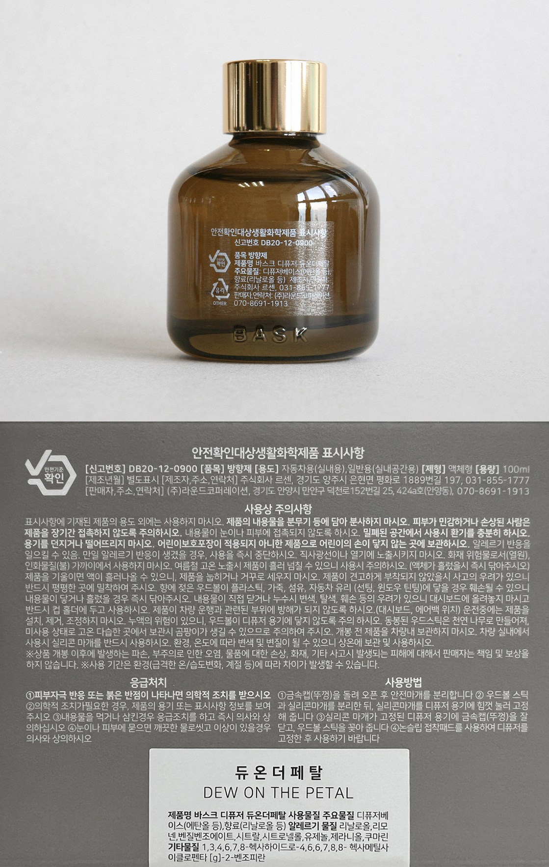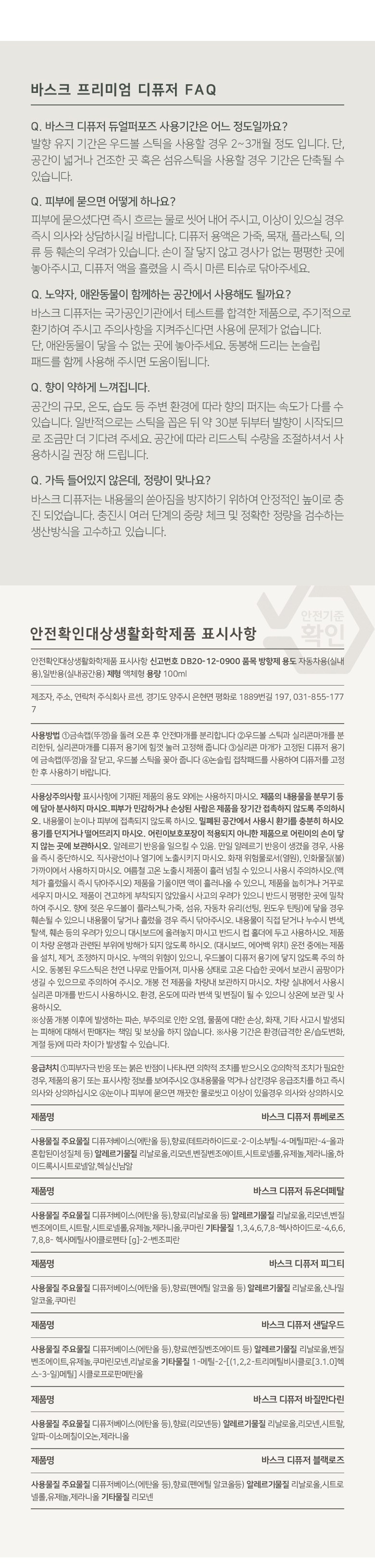 | 품목 및 제품명 | 방향제 / 바스크 디퓨저 듀온더페탈 | 용도(표백제의 경우 계열을 함께표시) 및 제형 | 자동차용(실내용), 일반용(실내공간용) / 액체형 |