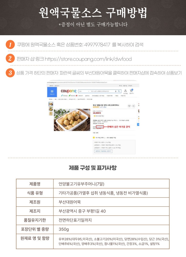 | 생산자 및 소재지 | 부산대원어묵 / 부산광역시 중구 부평1길 40 | 제조연월일, 소비기한 또는 품질유지기한 | 유 통 기 한 : 전면 하단표기일까지 |