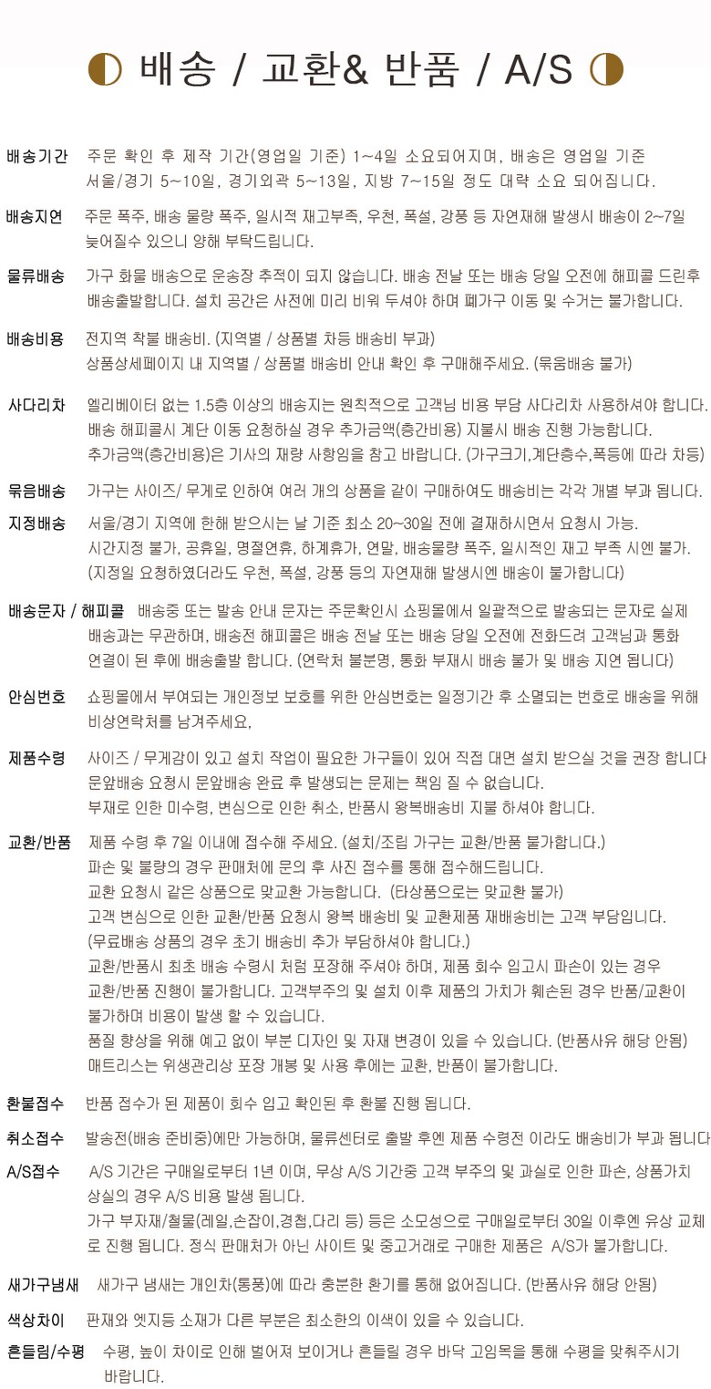- ㆍ모니터 해상도의 차이로 인해 색상이나 이미지가 실제와 달라, 고객이 단순 변심으로 교환/반품을 무료로 요청하는 경우