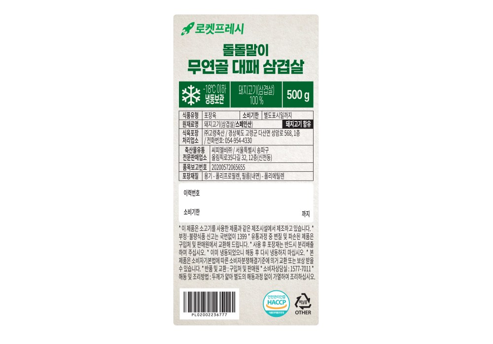 | 품목 또는 명칭 | 돌돌말이 무연골 대패 삼겹살 | 포장단위별 내용물의 용량(중량),수량,크기 | 컨텐츠 참조 |