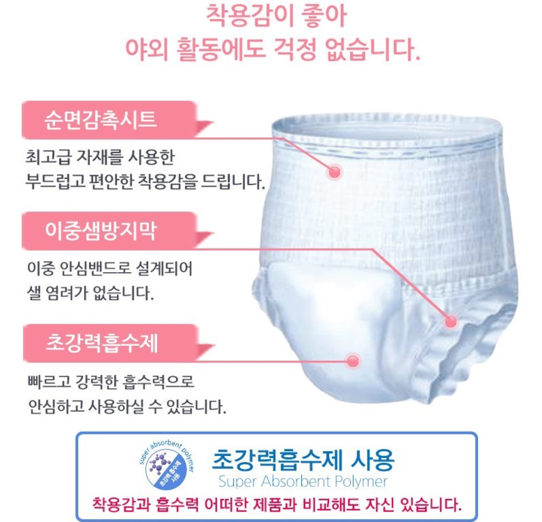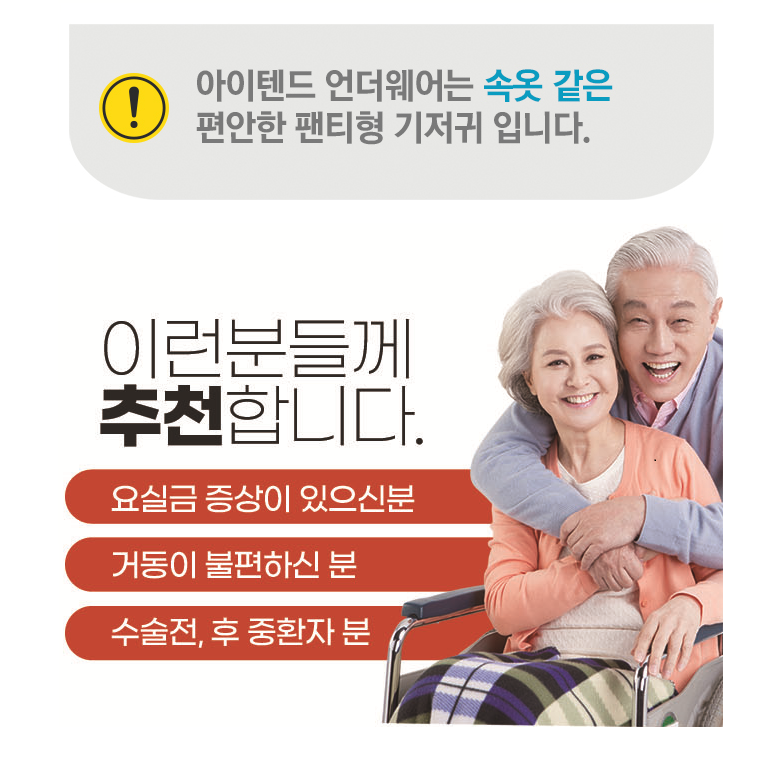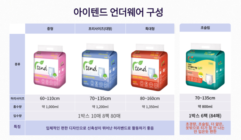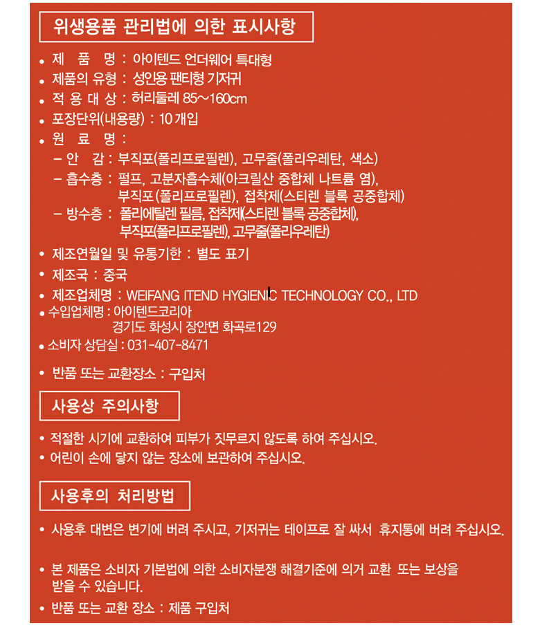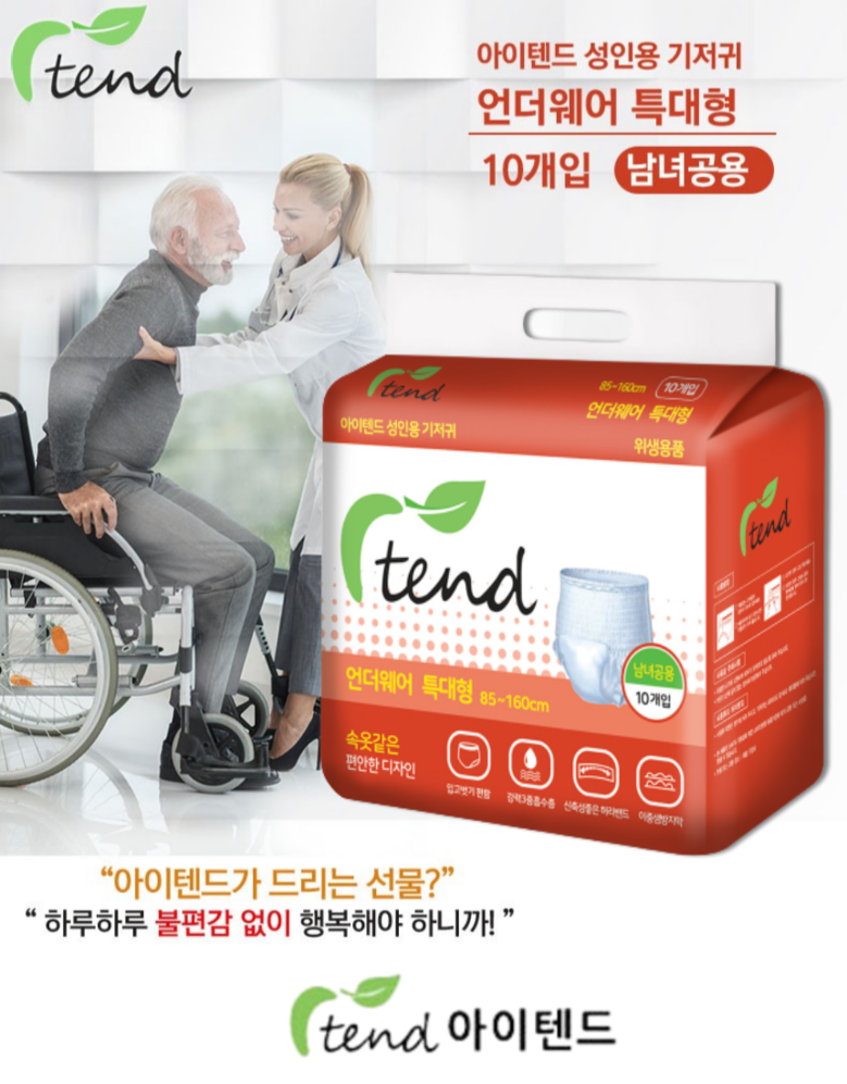 | 품명 및 모델명 | 아이텐드 성인용 기저귀 언더웨어 특대형 | 인증/허가 사항 | 없음 |