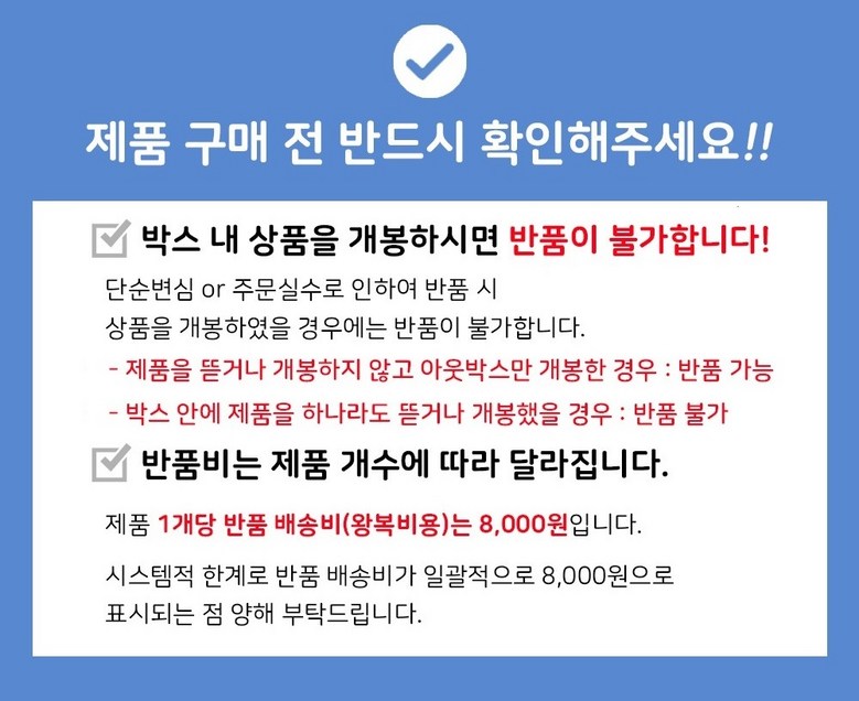 | 교환/반품 비용 (왕복비용) | 8,000원 - 단, 고객 변심의 경우에만 발생 - 도서산간 및 일부 지역 추가비용 발생 |