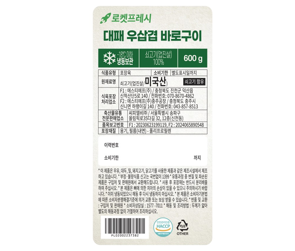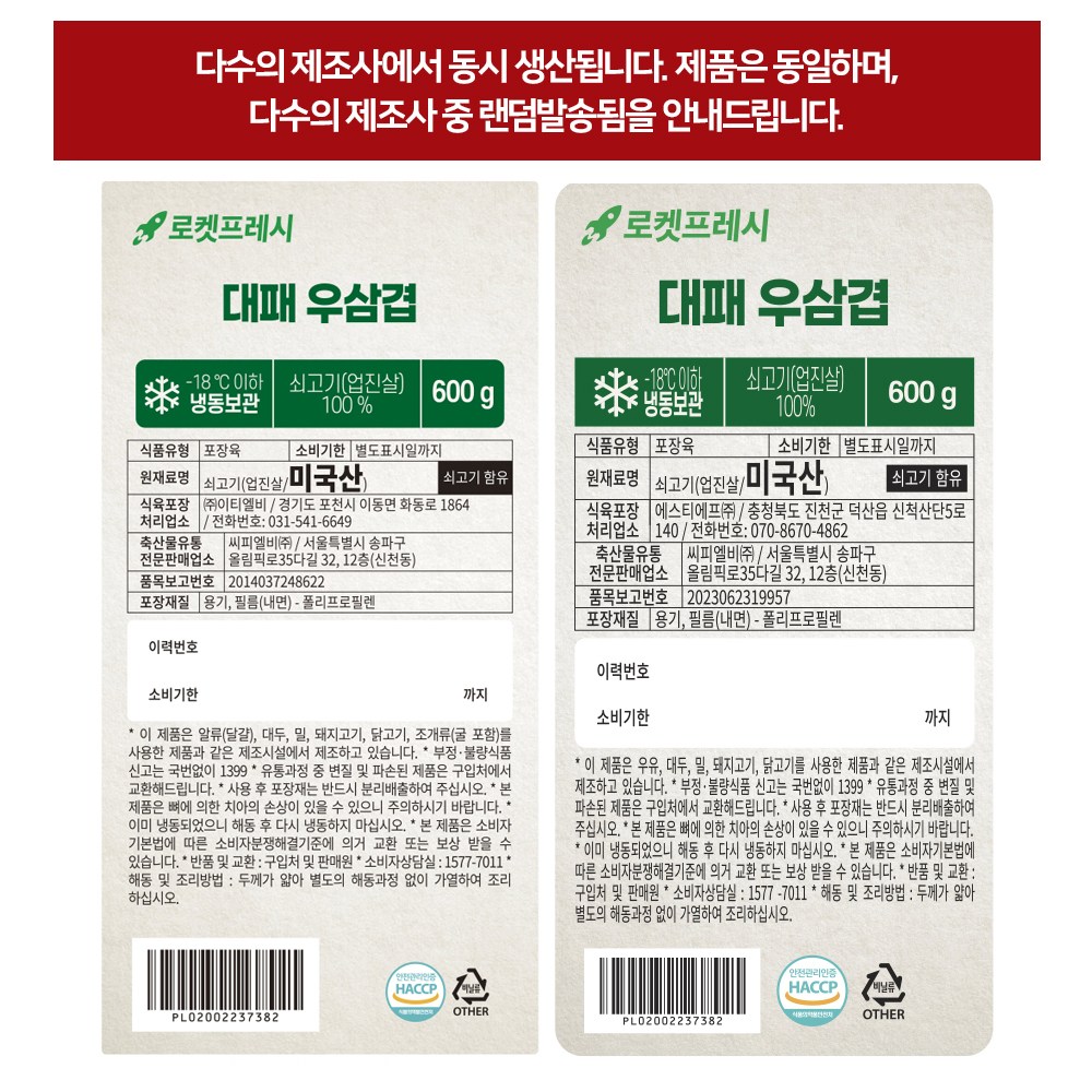 | 품목 또는 명칭 | 대패 우삼겹 | 포장단위별 내용물의 용량(중량),수량,크기 | 600g x 2팩,1개 |