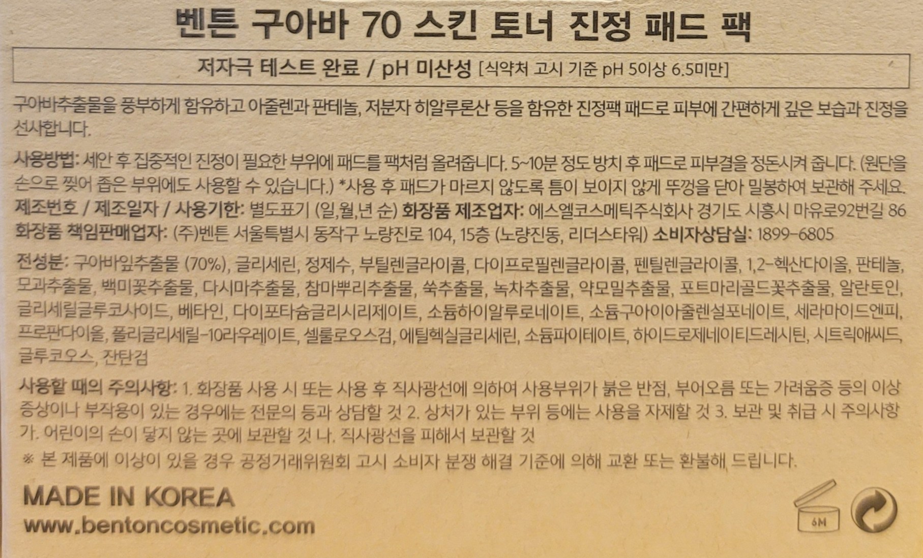 | 화장품제조업자, 화장품책임판매업자 및 맞춤형화장품판매업자 | 에스엘코스메틱주식회사 / (주)벤튼 | 제조국 | 대한민국 |