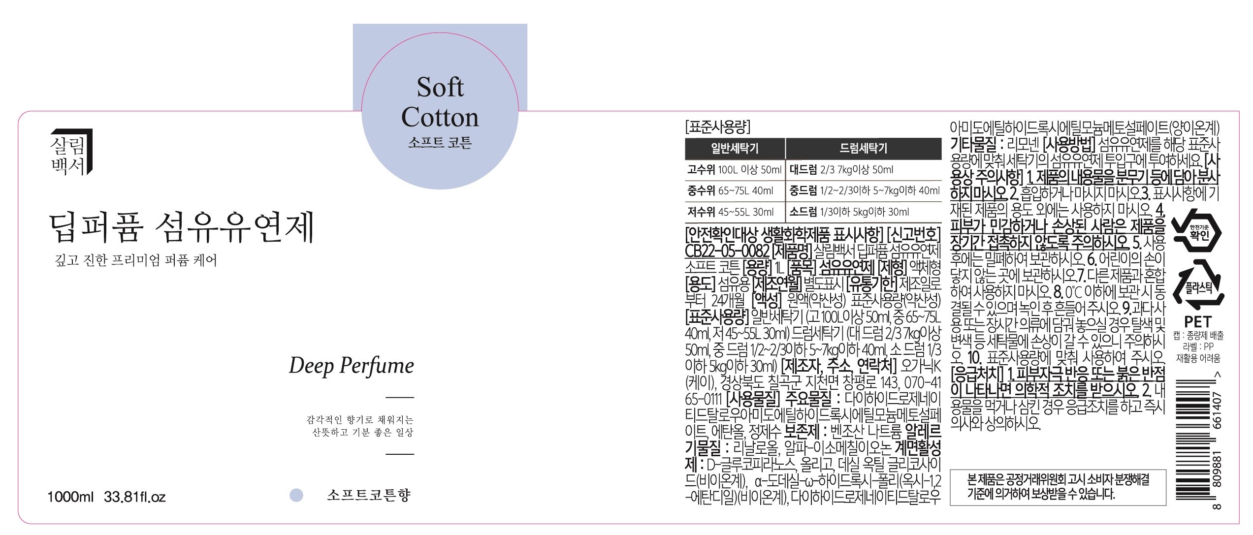 | 품목 및 제품명 | 섬유유연제 / 살림백서 딥퍼퓸 섬유유연제 소프트 코튼 | 용도(표백제의 경우 계열을 함께표시) 및 제형 | 섬유용 / 비분사형-액체형 |