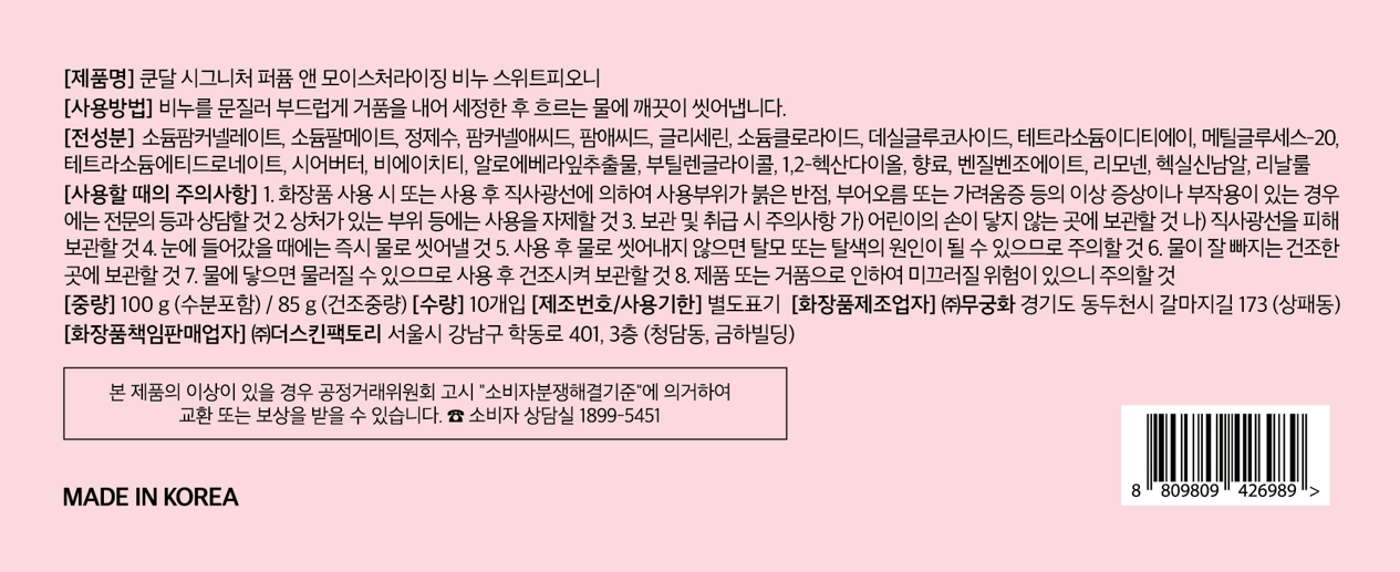 | 화장품제조업자, 화장품책임판매업자 및 맞춤형화장품판매업자 | ㈜무궁화 / ㈜더스킨팩토리 | 제조국 | 대한민국 |
