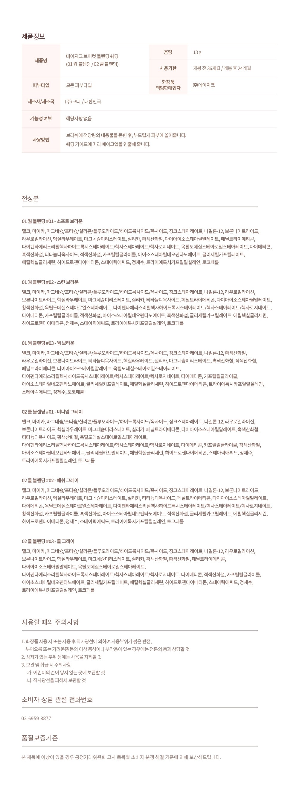| 화장품제조업자, 화장품책임판매업자 및 맞춤형화장품판매업자 | (주)코디/컨텐츠 참조 | 제조국 | 컨텐츠 참조 |